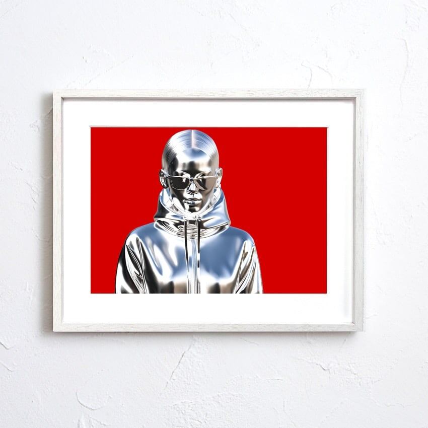 金属の質感と女性像を融合した、クールで独創性の高いアートポスターです。