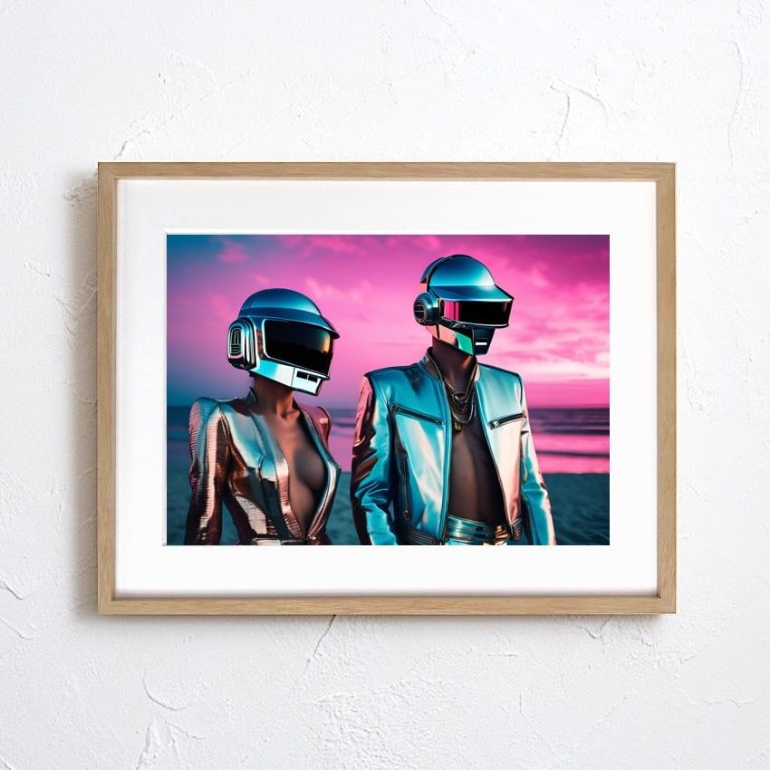 Beach Date 2062|未来の恋人たちを描くネオレトロアート|モダン空間に映える近未来ビーチポスター|額縁付きA4ポスター