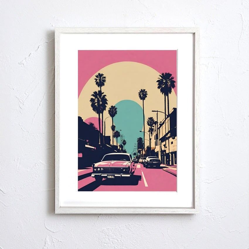 ロサンゼルスのブルーバードとサンセットを、鮮やかなレトロカラーで描いた一枚。