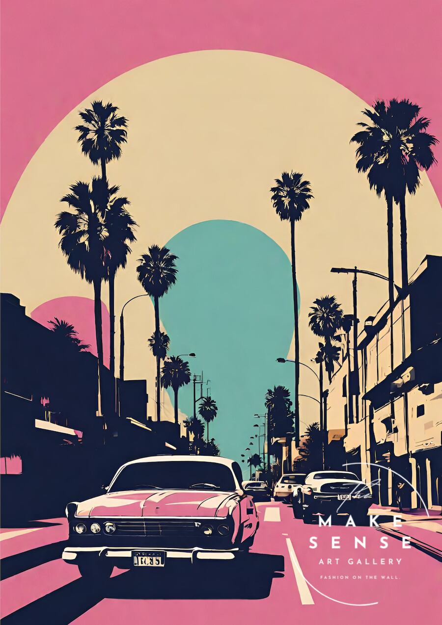 ロサンゼルスのブルーバードとサンセットを、鮮やかなレトロカラーで描いた一枚。