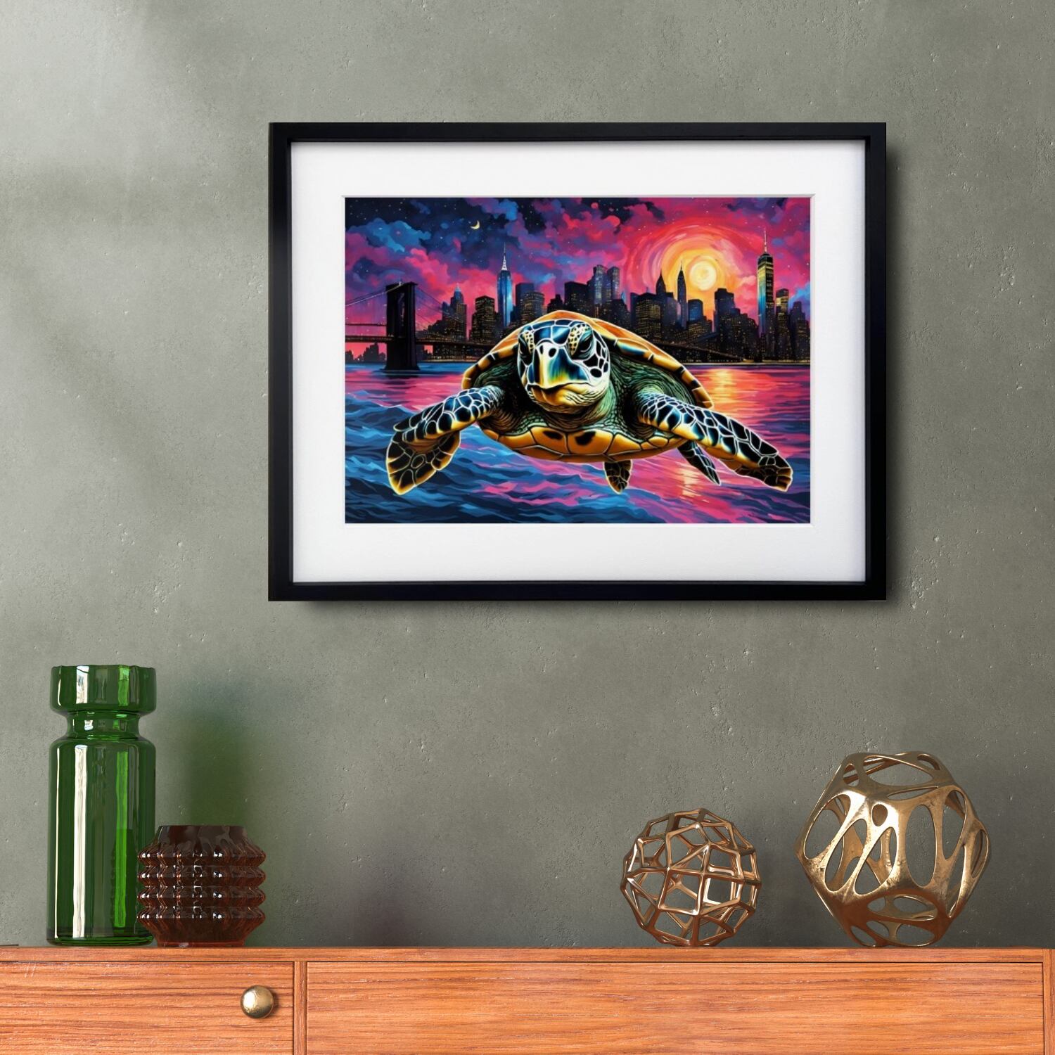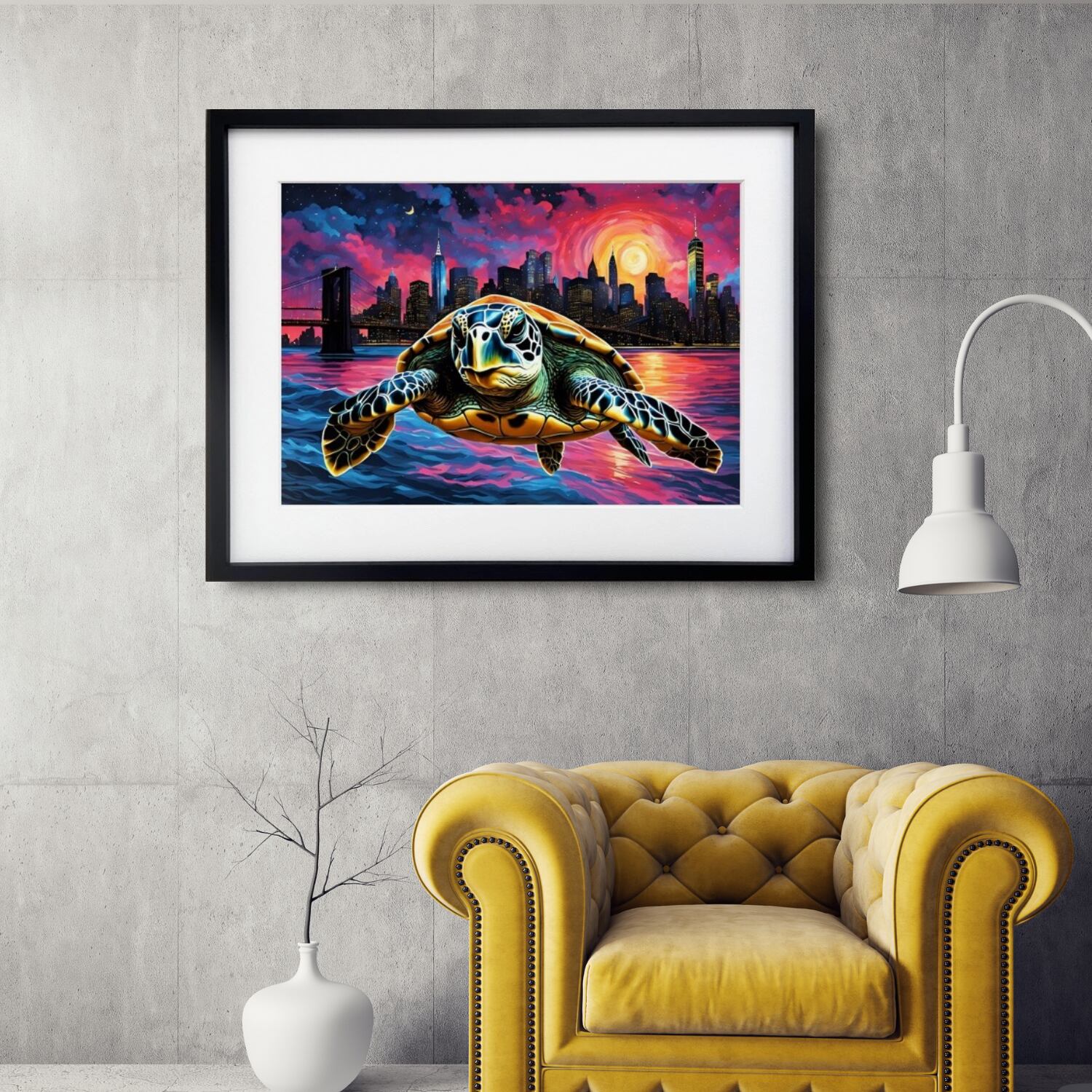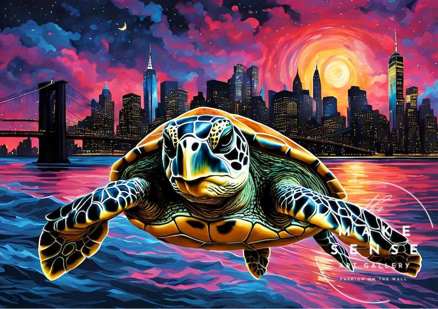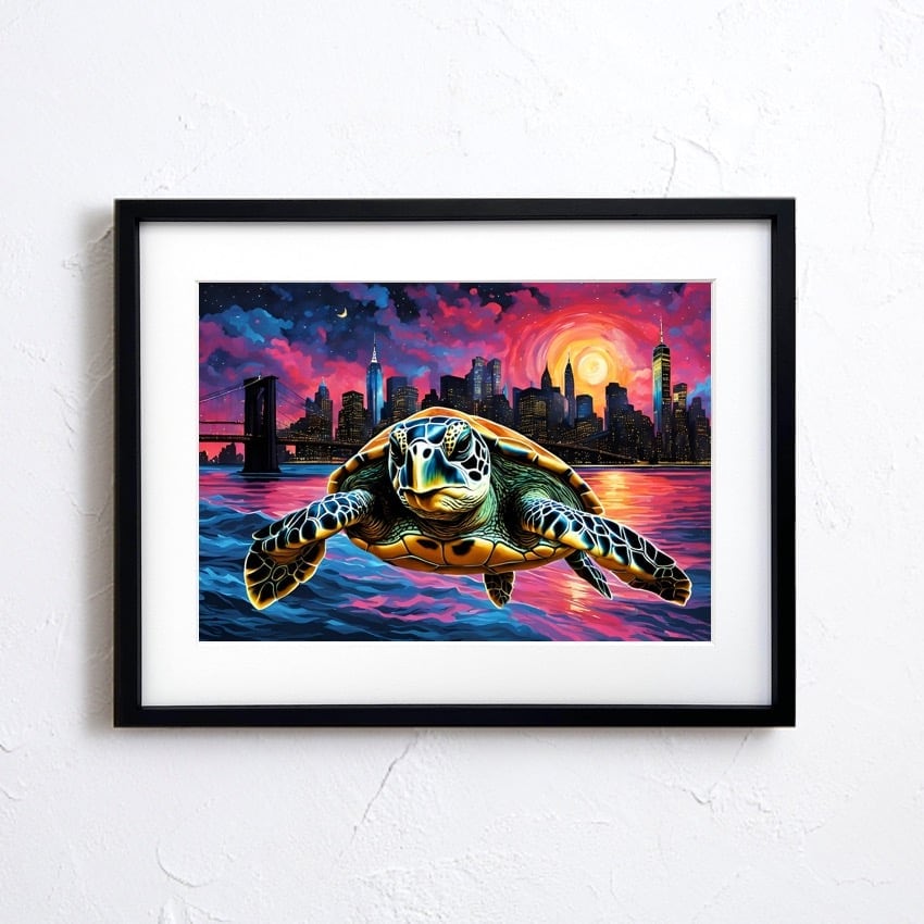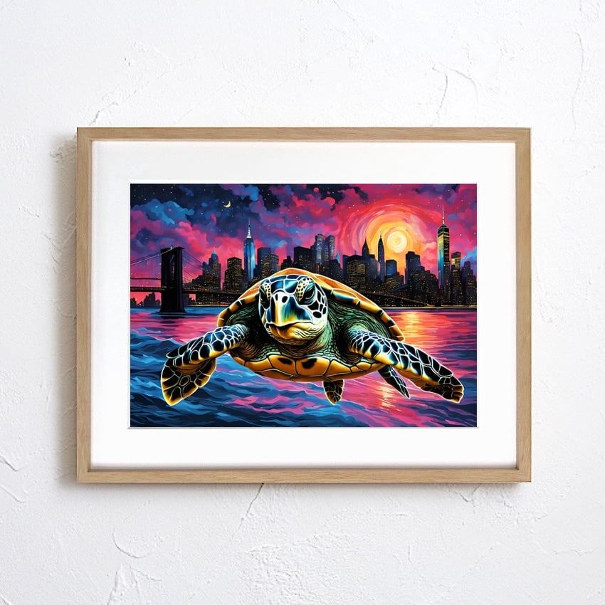 Leaving New York|コラージュアートポスター 空を飛ぶ亀が描く幻想世界|モダン空間を彩るユニークで神秘的なインテリア作品A2ポスター