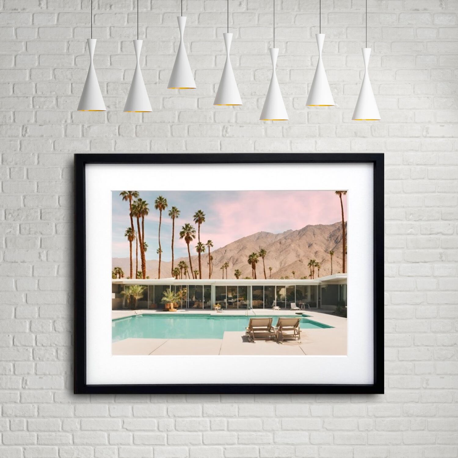 西海岸・ハリウッドの開放感あふれるプールサイド風景を描いたレトロモダンなアートポスター。