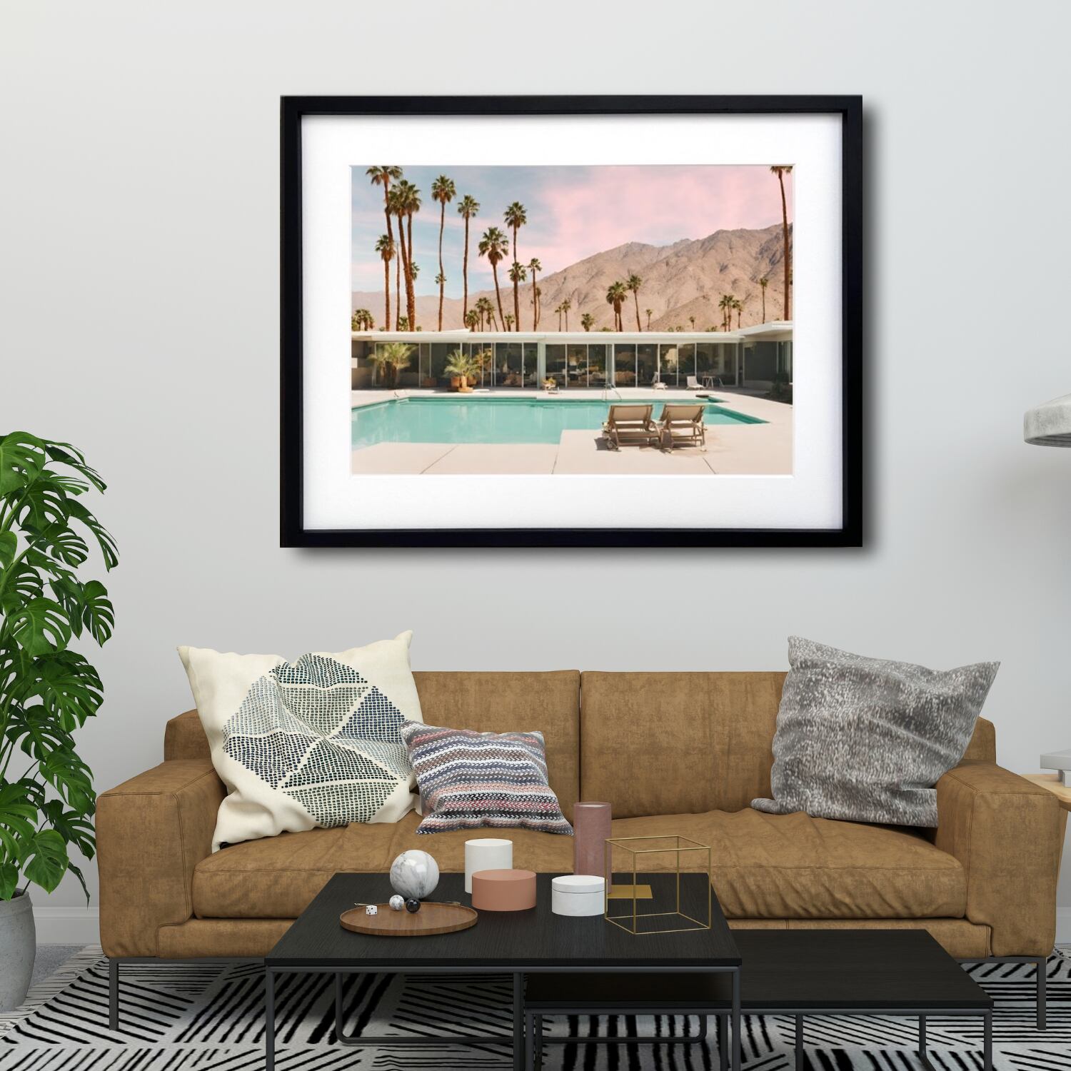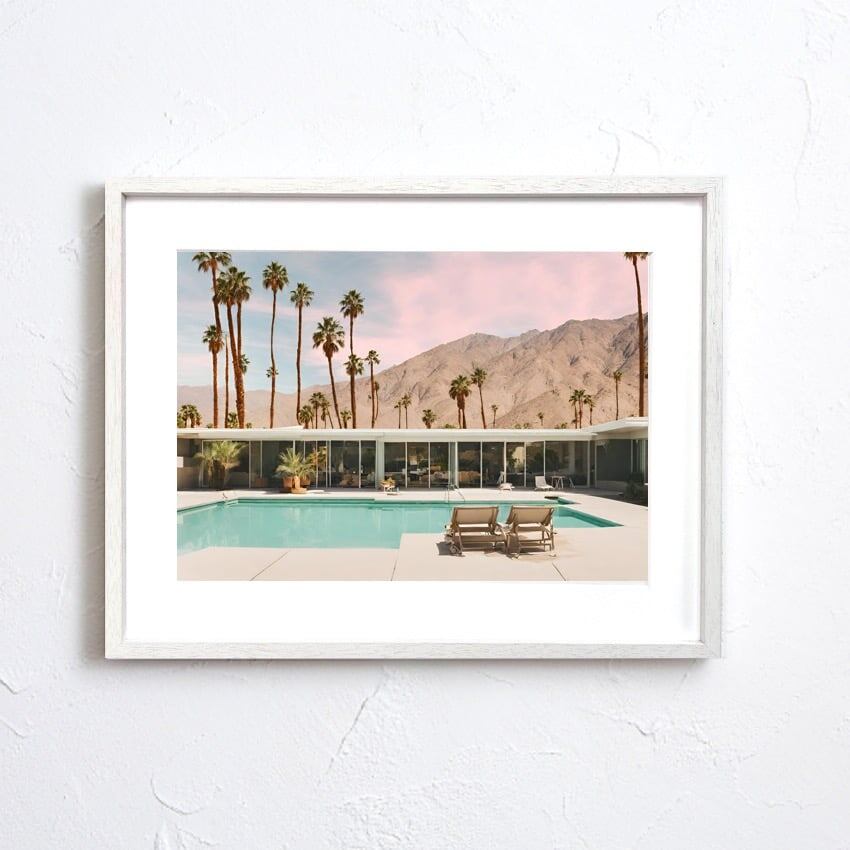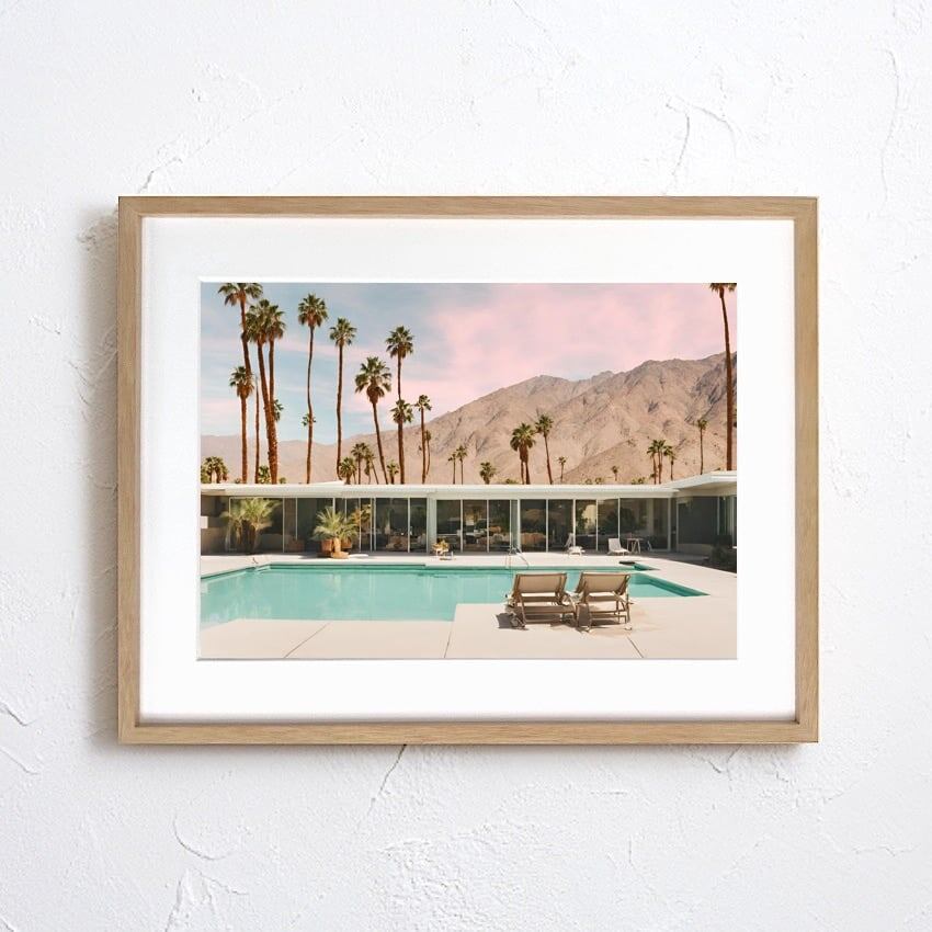 西海岸・ハリウッドの開放感あふれるプールサイド風景を描いたレトロモダンなアートポスター。