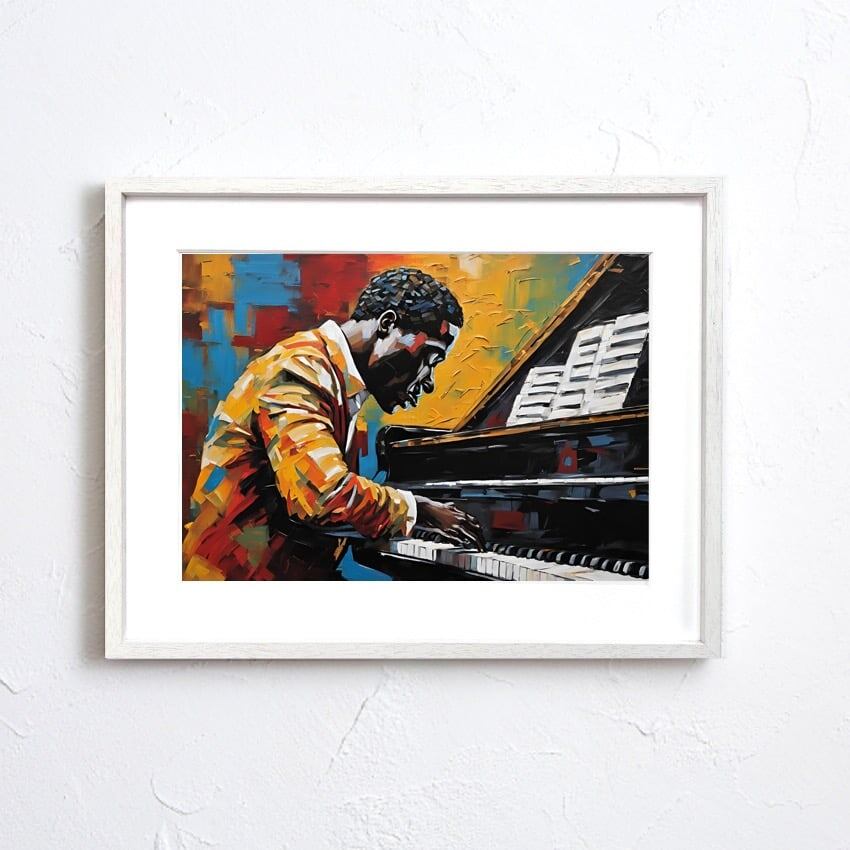ピアノに没頭する男性を描いたドラマティックなアートポスター。