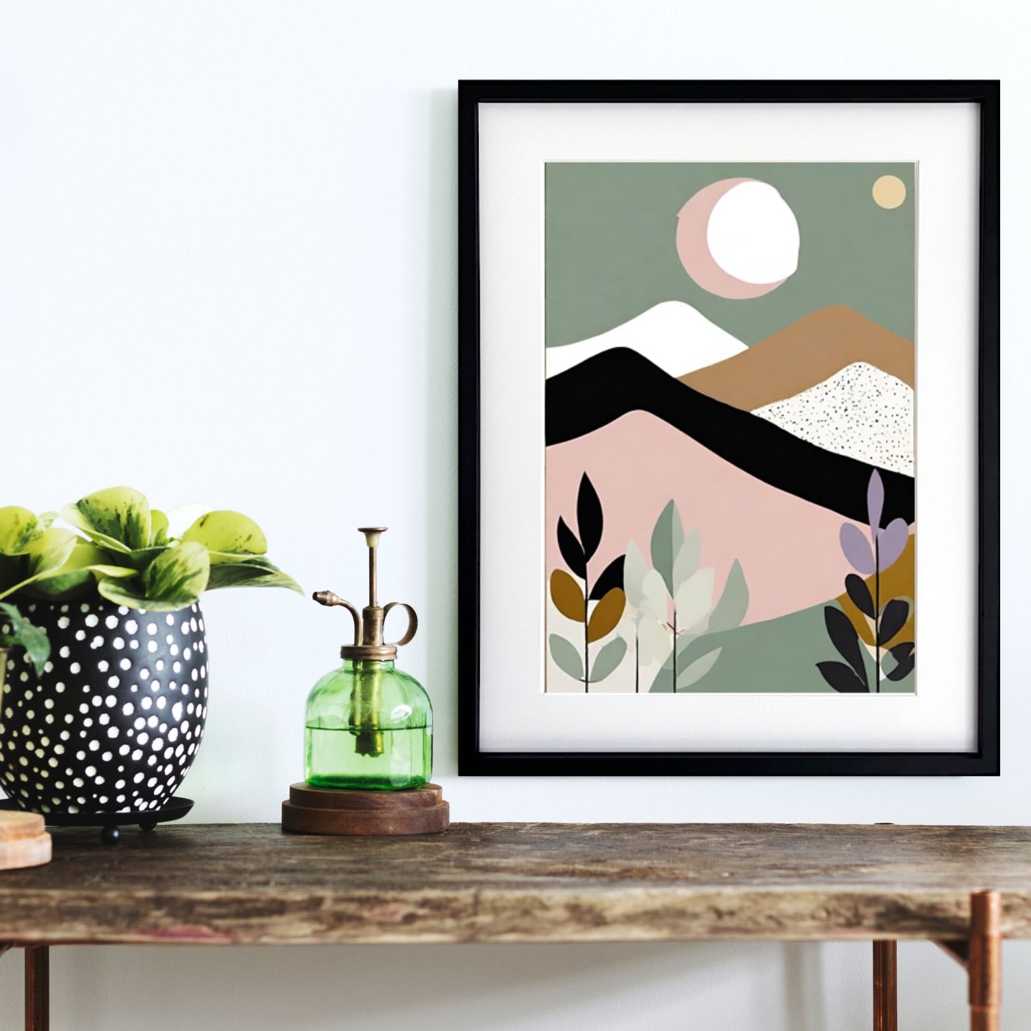 月と山を落ち着いたレトロボヘミアン調で描いたアートポスター|moonlit night|Make Sense|北欧ミニマルに合う静かな風景