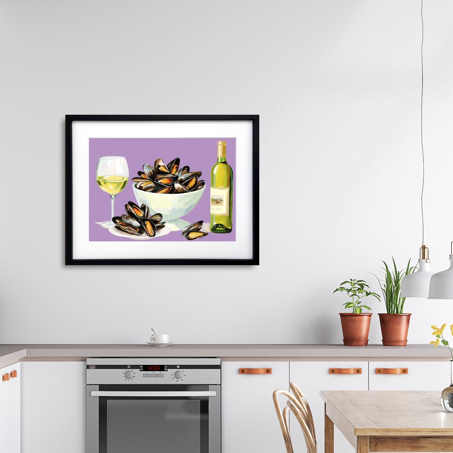「Mussels」は、ムール貝の白ワイン蒸しをスタイリッシュに描いた美食モチーフのアート。