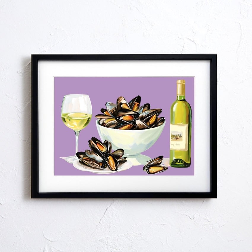 「Mussels」は、ムール貝の白ワイン蒸しをスタイリッシュに描いた美食モチーフのアート。
