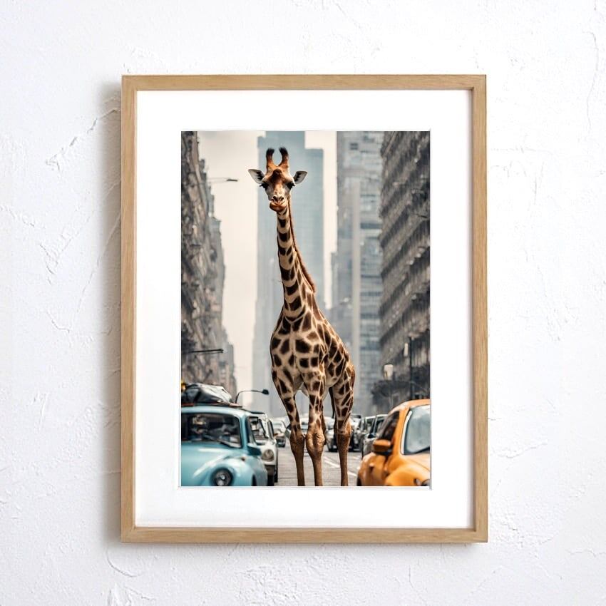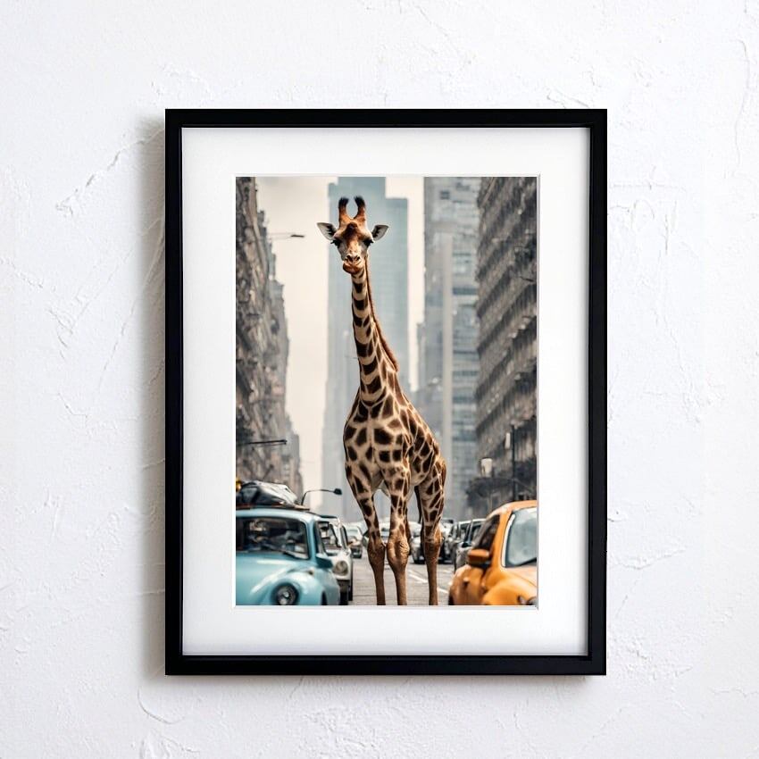 Giraffe Trip|都会を歩くキリンのコラージュアートポスター|個性派インテリアに映える非現実デザイン| A3ポスター