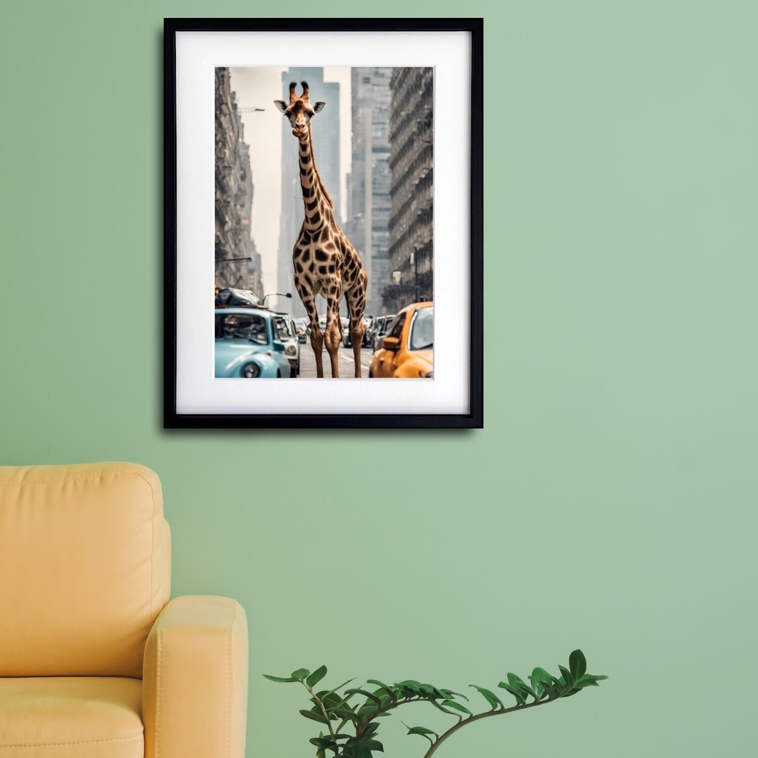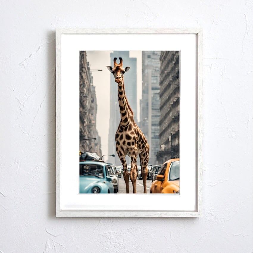 Giraffe Trip|都会を歩くキリンのコラージュアートポスター|個性派インテリアに映える非現実デザイン| A2ポスター