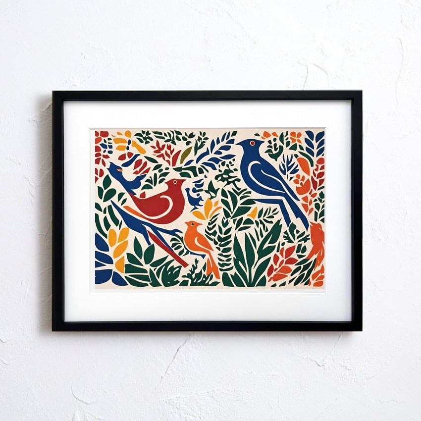 切り絵風のボタニカルモチーフに、カラフルな鳥たちが描かれた“楽園”アート。