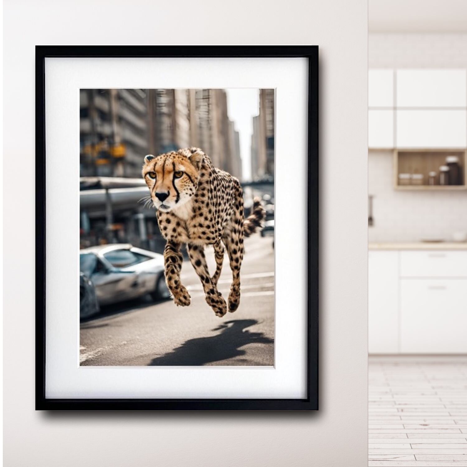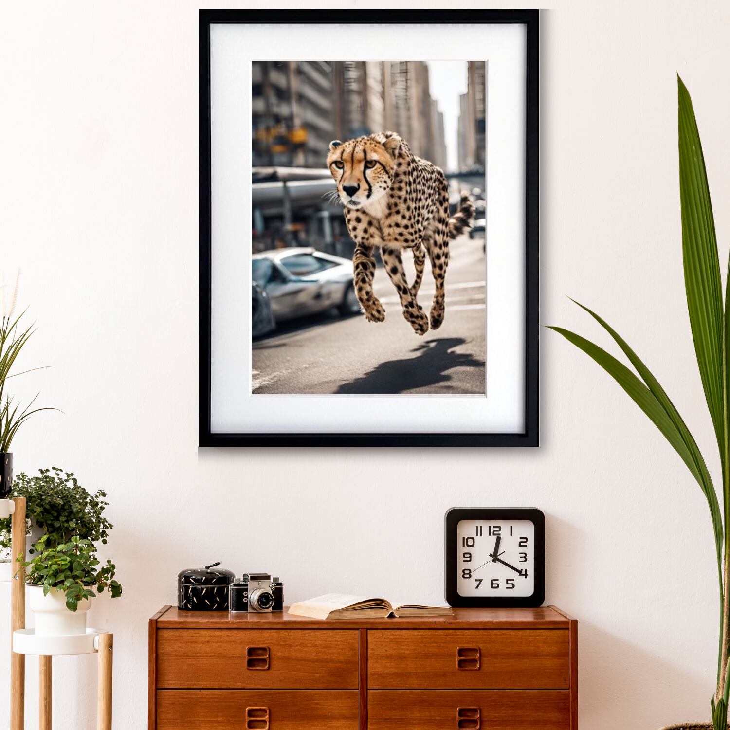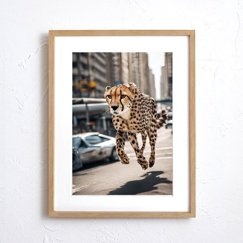 Cheetah Trip|都会を駆け抜けるチーターのコラージュアートポスター|非日常感とインパクトで魅せる額縁セット|A4〜A2 A3ポスター