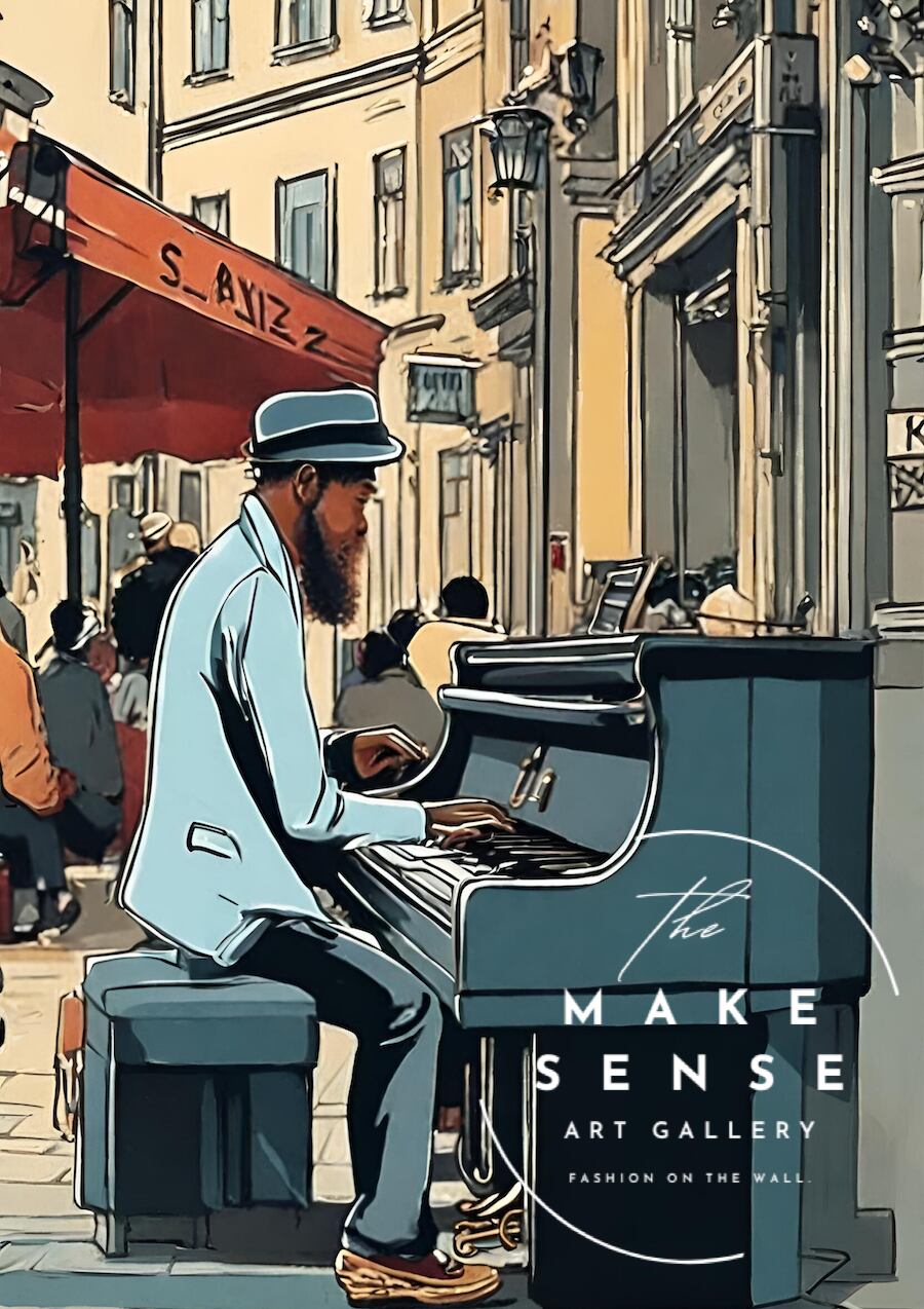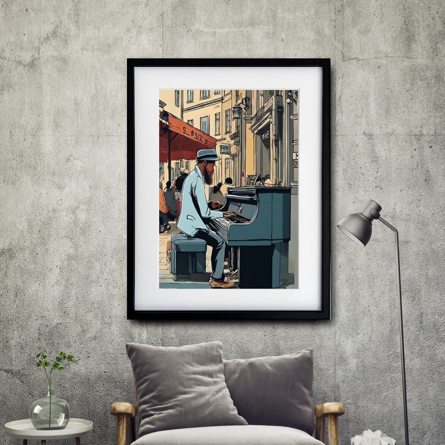 Street Musician|街角のピアノと大人の渋さを描くジャズアートポスター||音楽好きに響くモダンアートA2ポスター