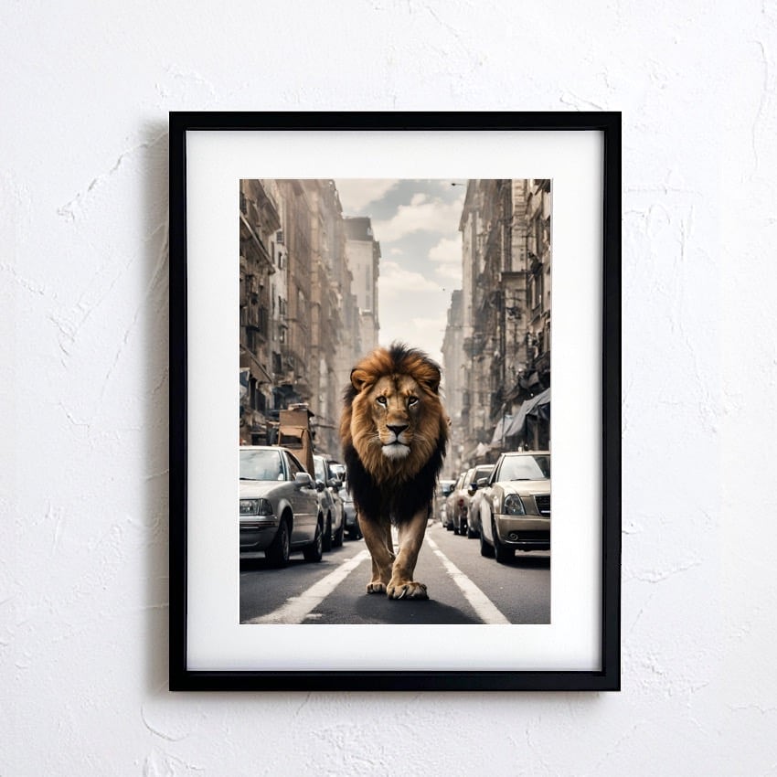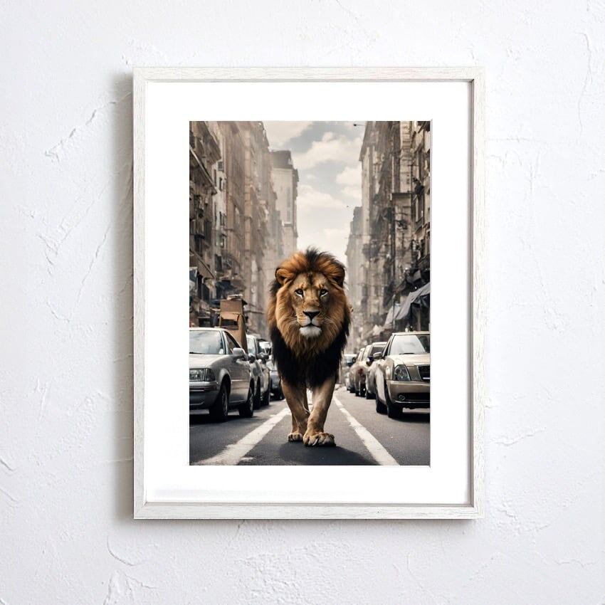 「Lion Trip」は、都会の街並みを悠々と歩くライオンを描いた独創的なアートポスター。