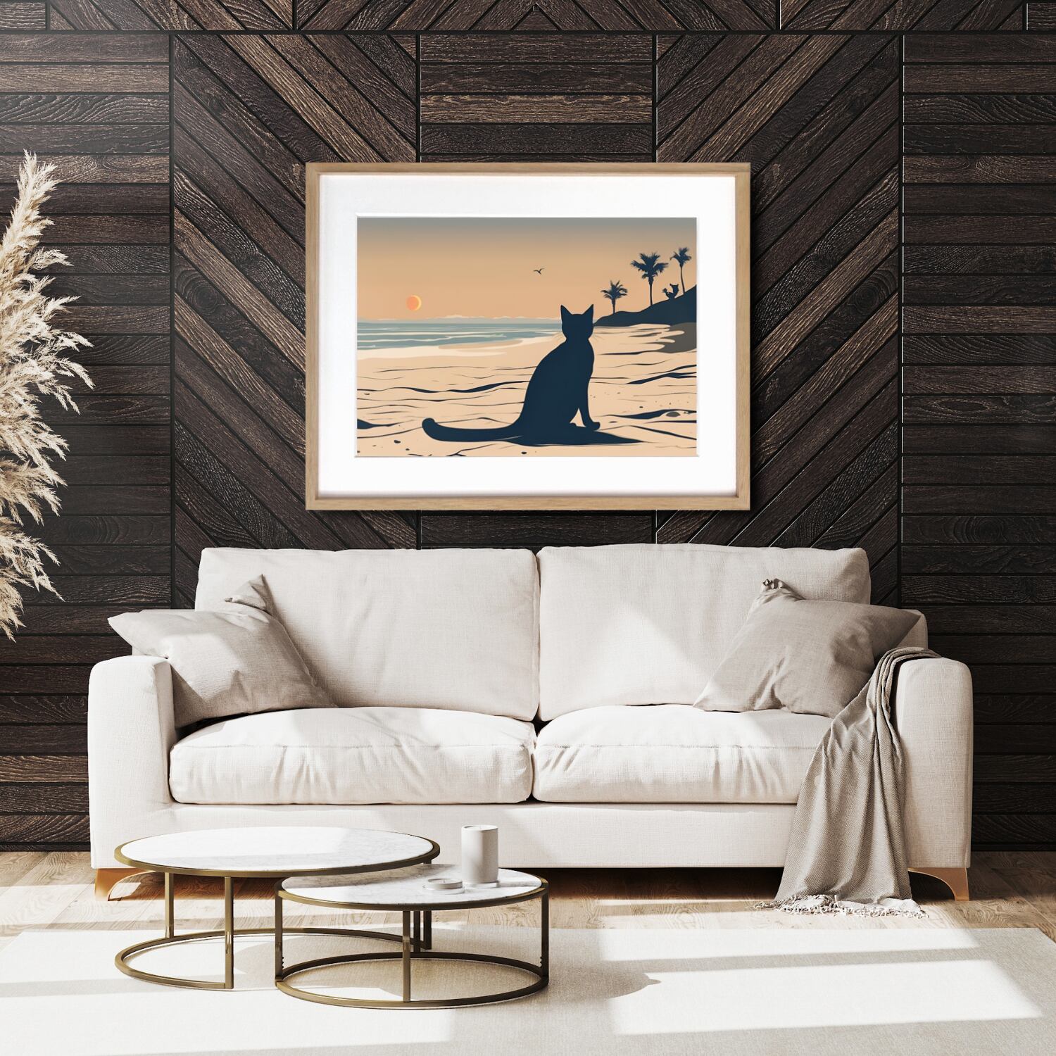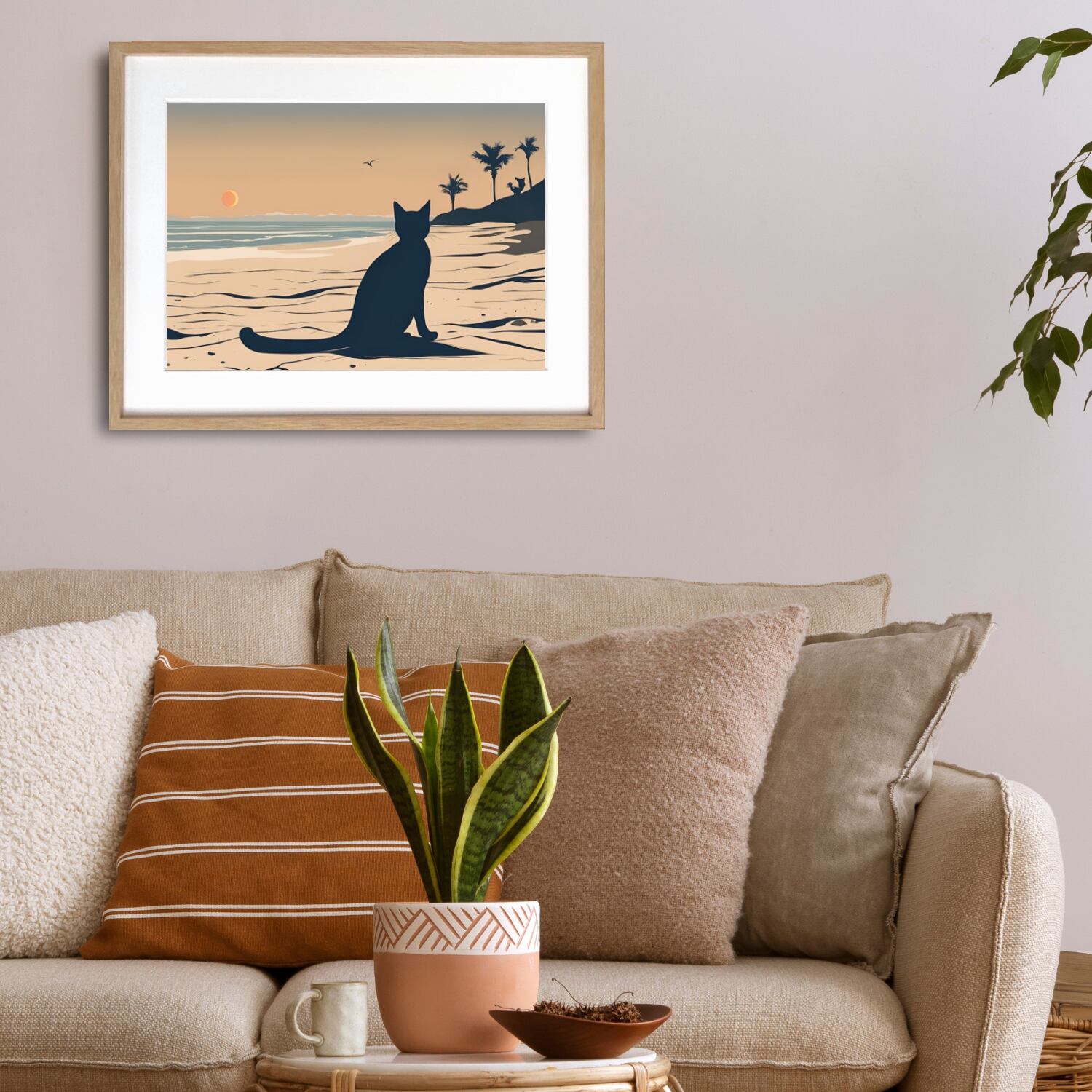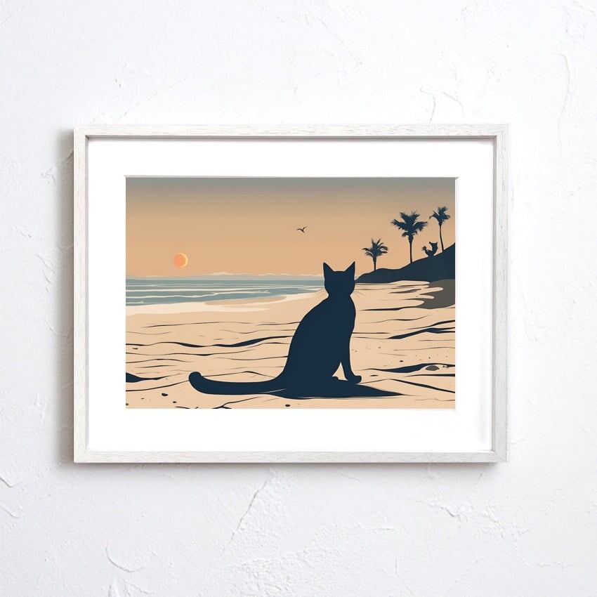 夕焼けを眺める黒猫|海辺のサンセットに佇む癒しのシルエットアート|可愛さと物語性が宿る一枚||A3ポスター