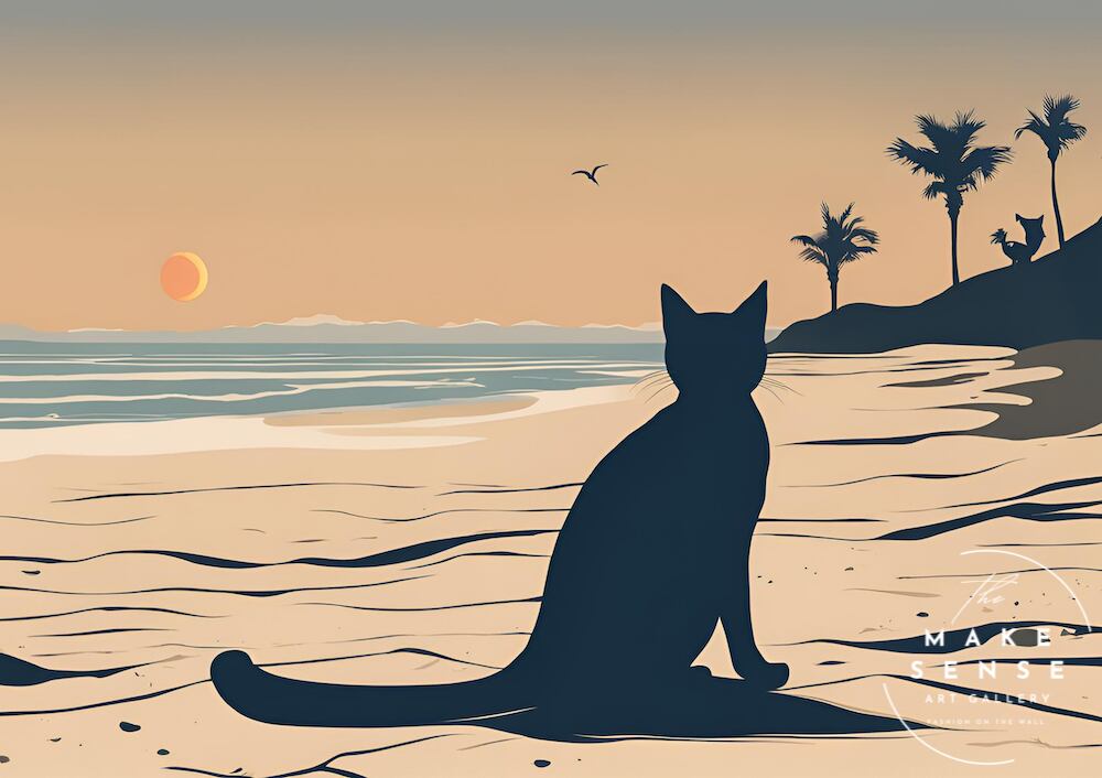 「夕焼けを眺める黒猫」は、海辺のサンセットに佇む一匹の黒猫を描いた情緒的なアートポスター。