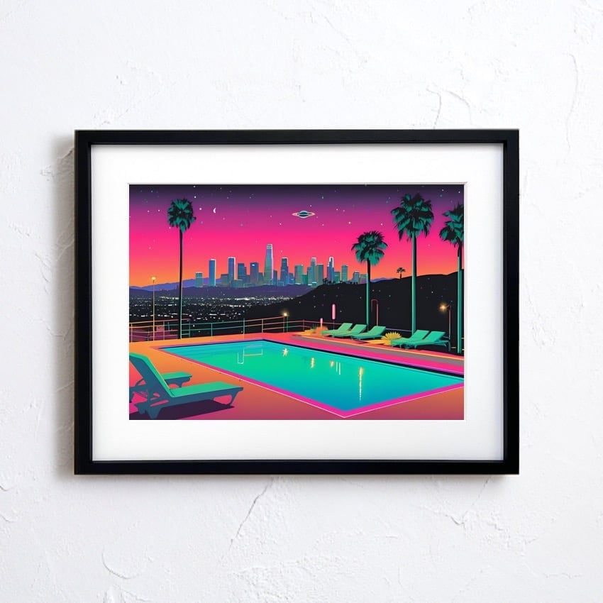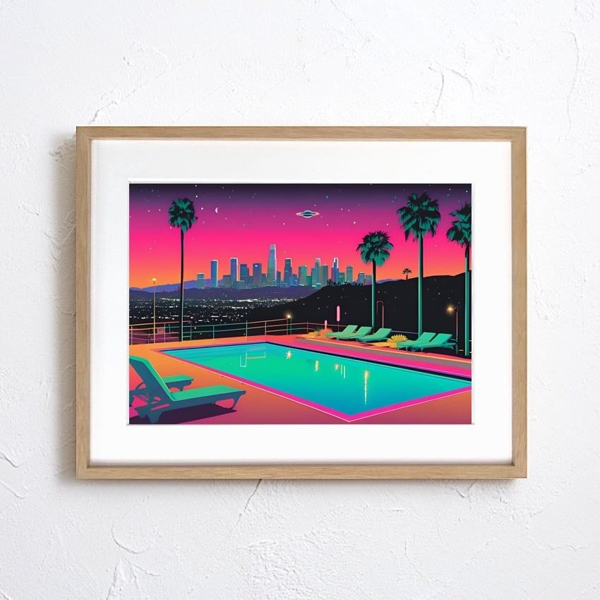 UFO came to downtown LA|サイバーパンクとレトロが交差するLA夜景アート|映画のような非日常を飾る一枚||A4ポスター