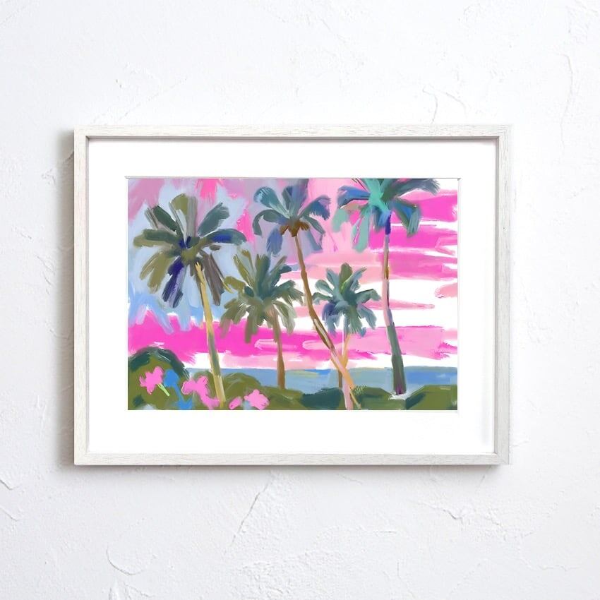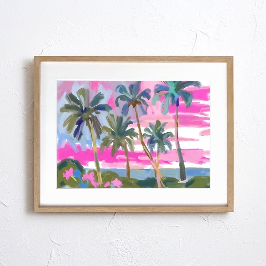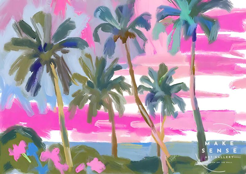 「Sunset Beach」は、ピンク色に染まる夕暮れの海を油絵調で描いた癒しのアートポスター。