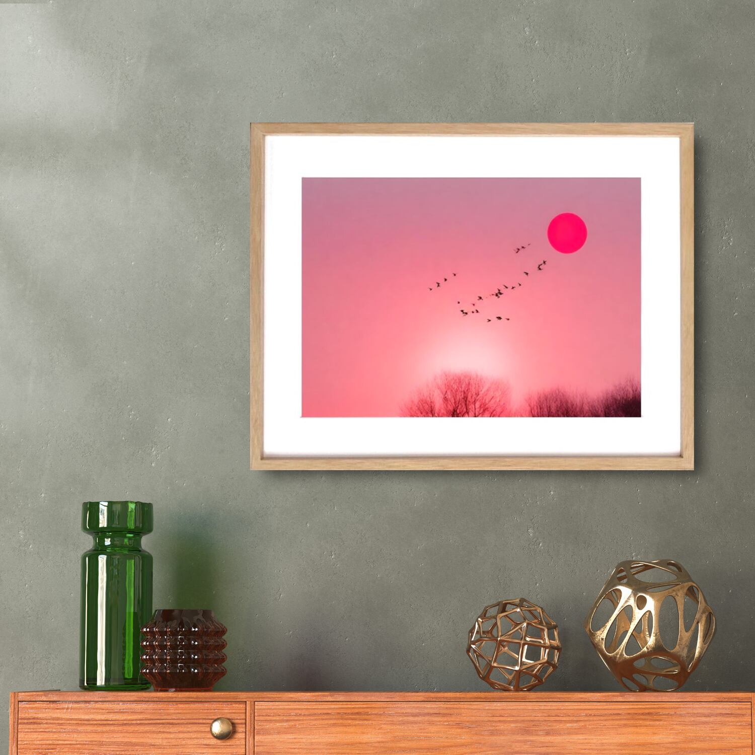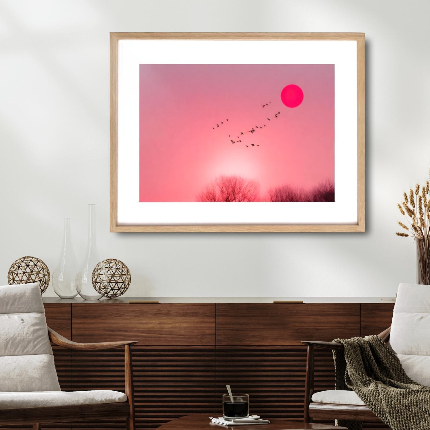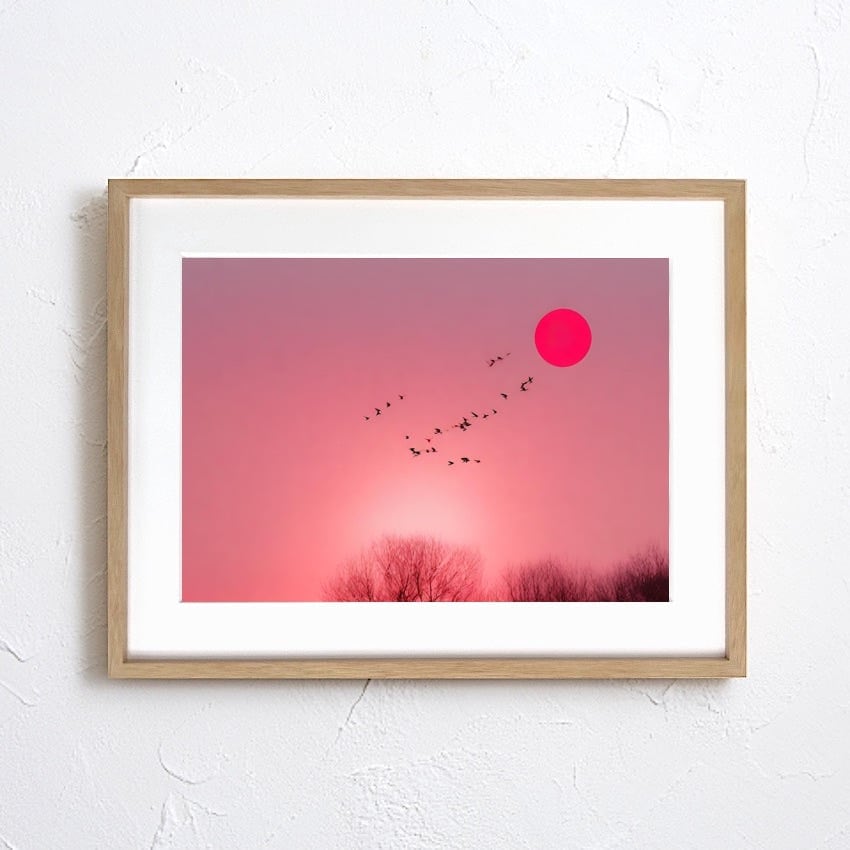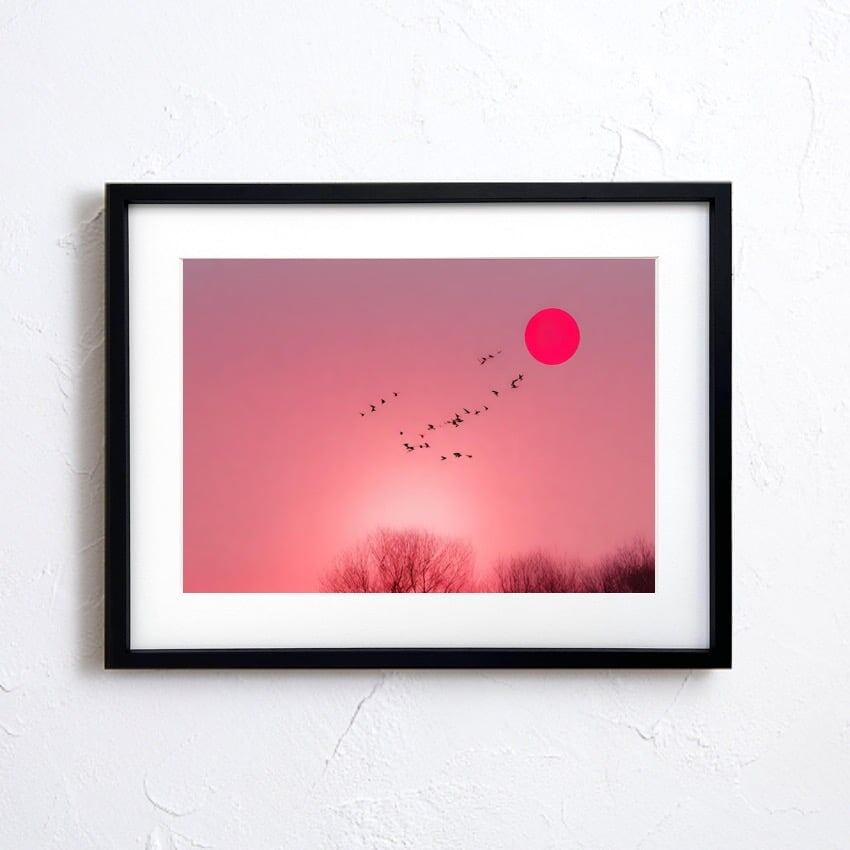 Graceful|夕日と飛翔する鳥のコラージュアートポスター|柔らかなピンク空が癒しを届けるモダンデザイン|額縁セット|A4ポスター
