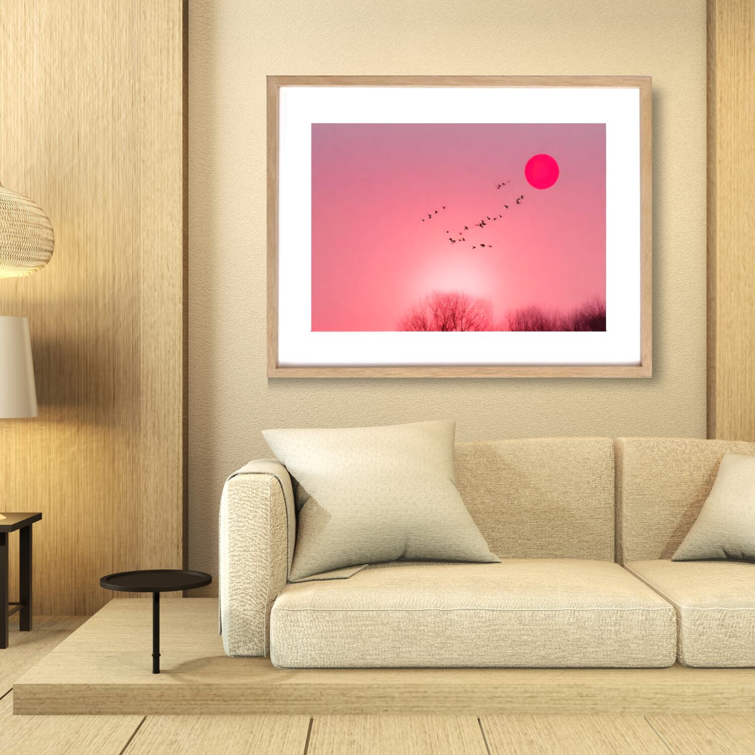 Graceful|夕日と飛翔する鳥のコラージュアートポスター|柔らかなピンク空が癒しを届けるモダンデザイン|額縁セット|A2ポスター