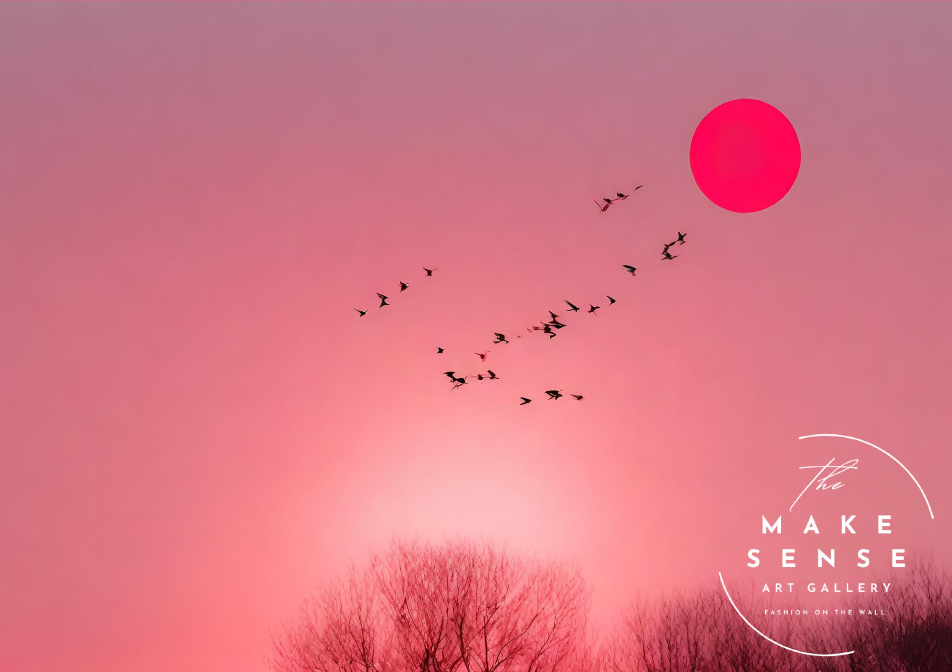 「Graceful」は、ピンクの夕空を舞う鳥たちをコラージュで描いた癒しのアートポスター。