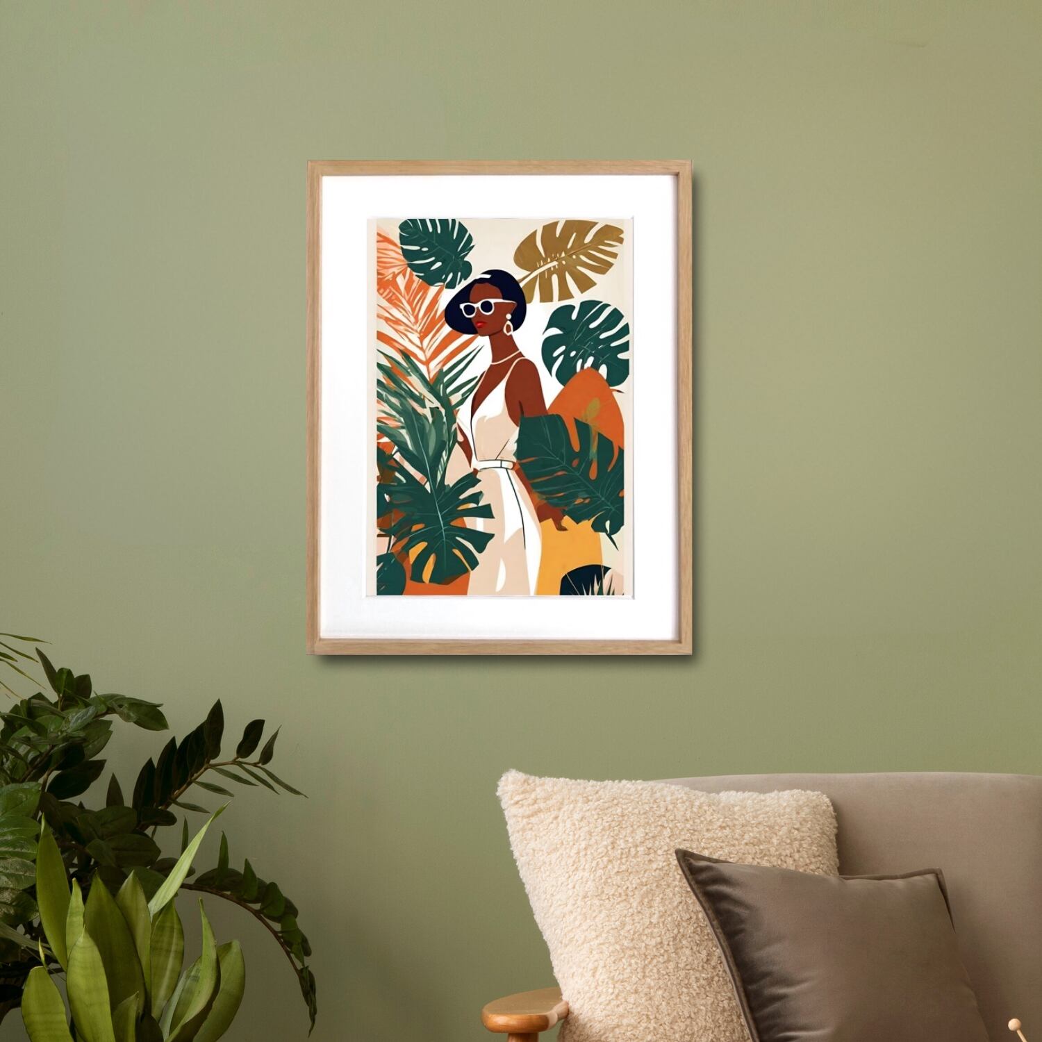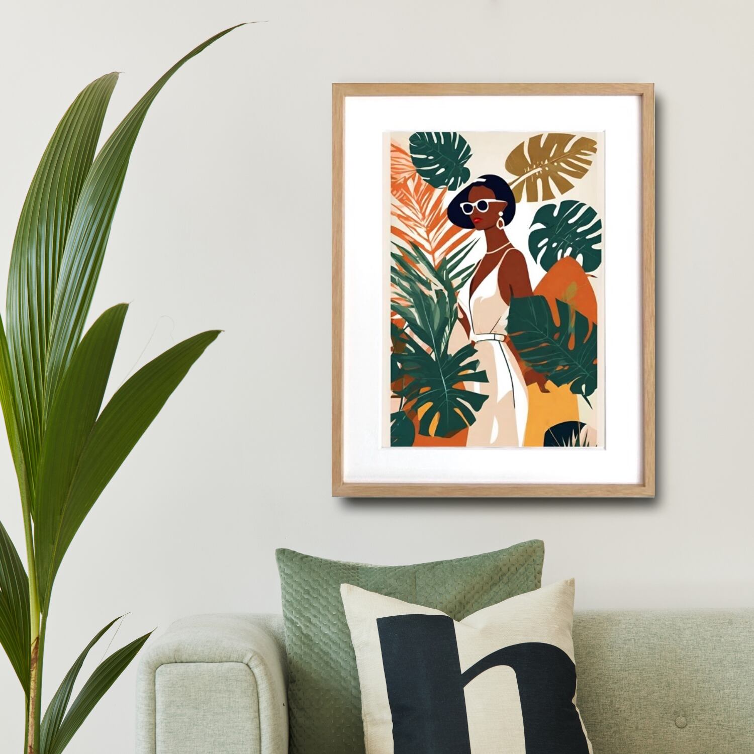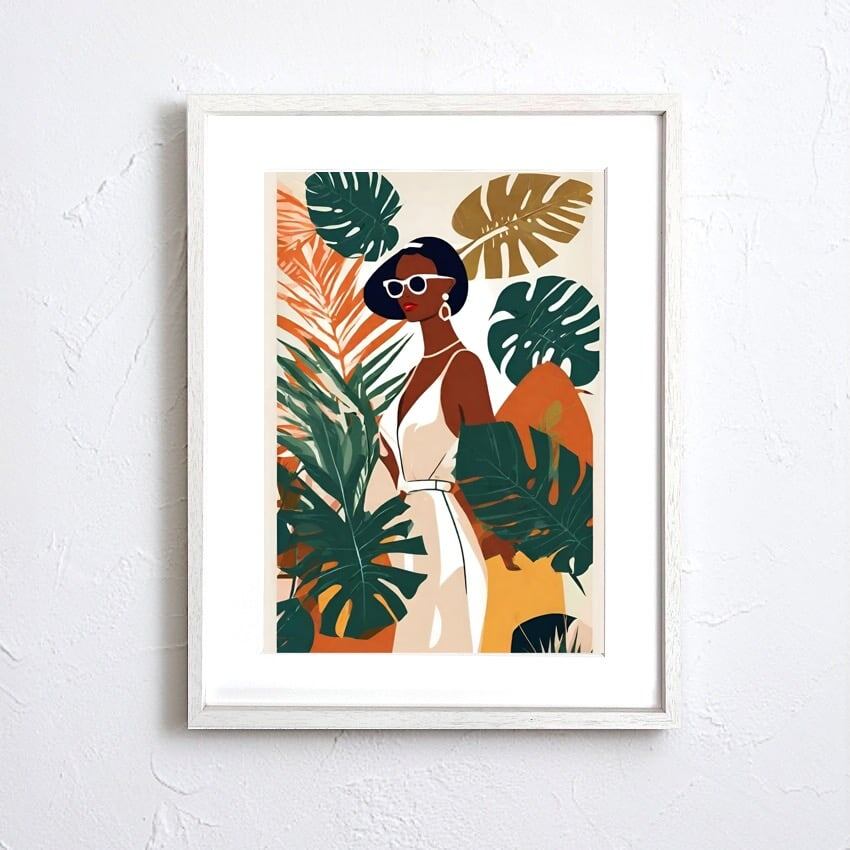 「Reverie(夢想)」は、白いドレスのアフロアメリカン女性を、抽象的×ボタニカルに描いたモダンアートポスター。