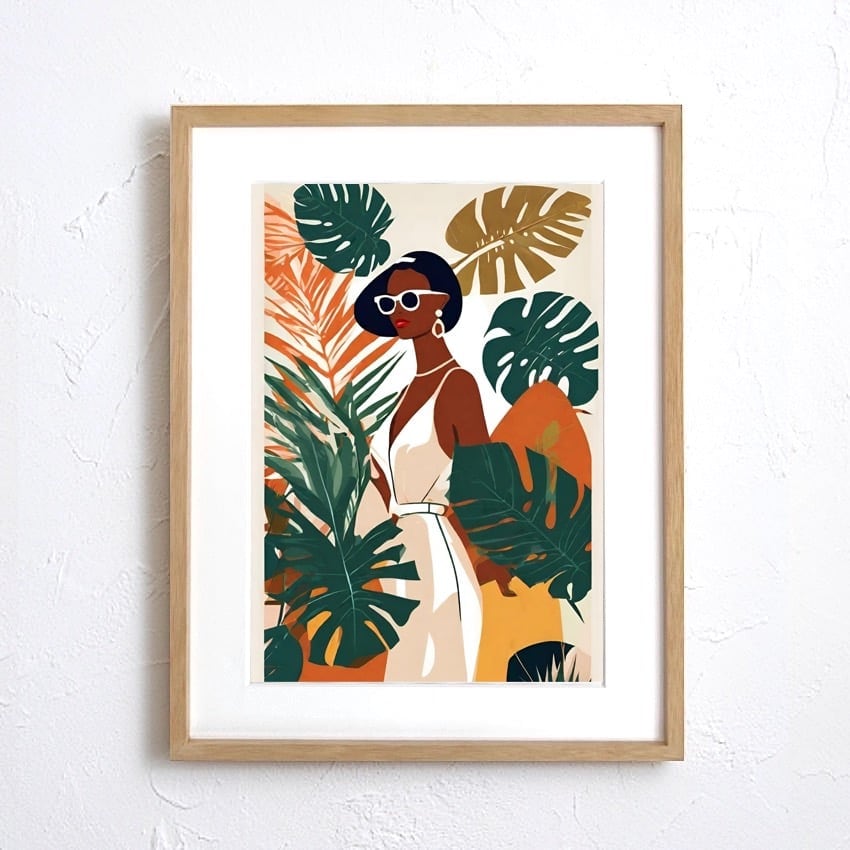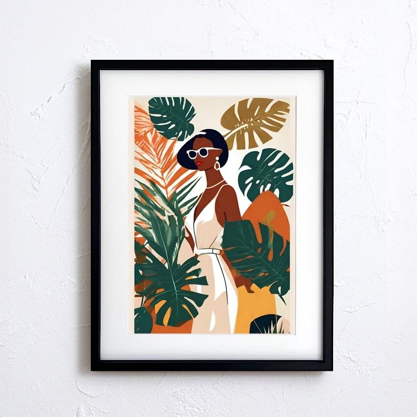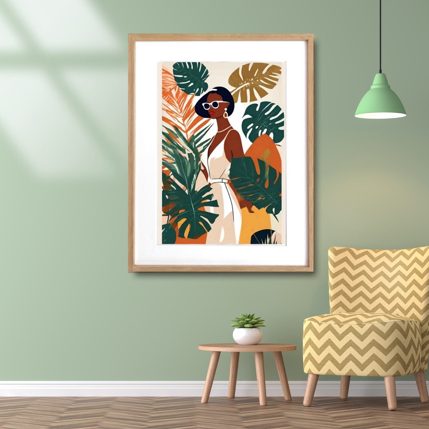 「Reverie(夢想)」は、白いドレスのアフロアメリカン女性を、抽象的×ボタニカルに描いたモダンアートポスター。