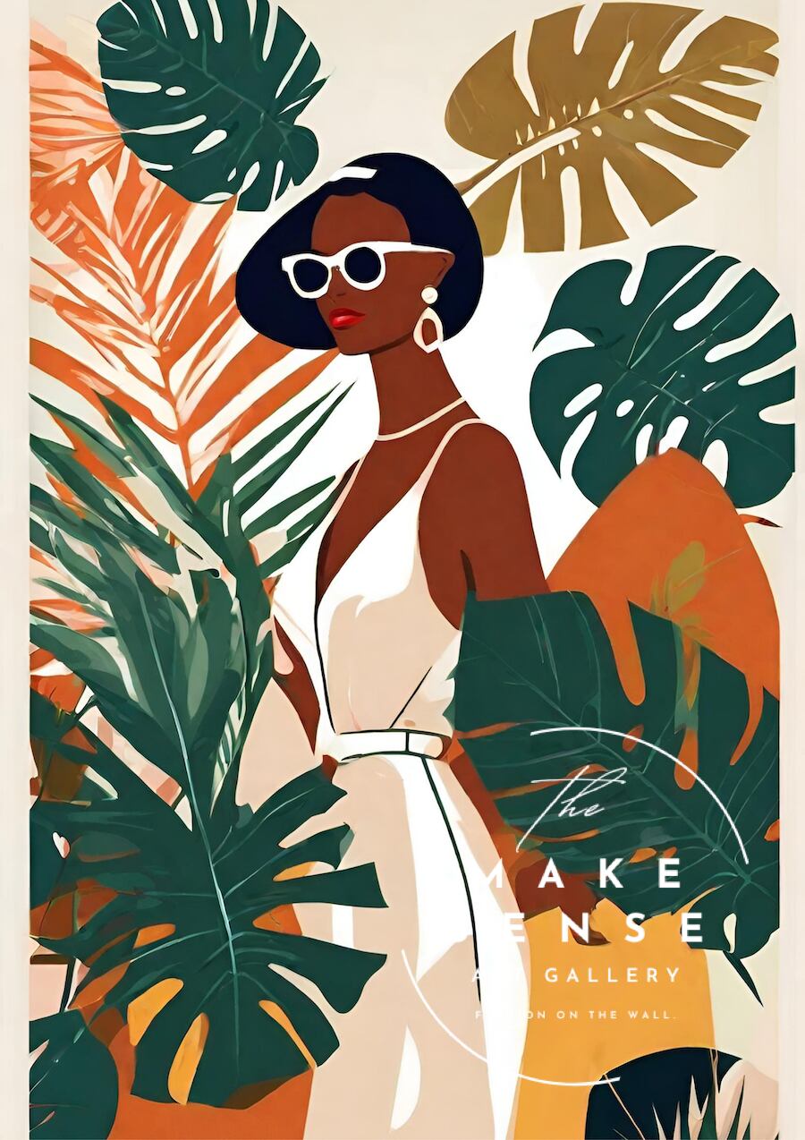 「Reverie(夢想)」は、白いドレスのアフロアメリカン女性を、抽象的×ボタニカルに描いたモダンアートポスター。