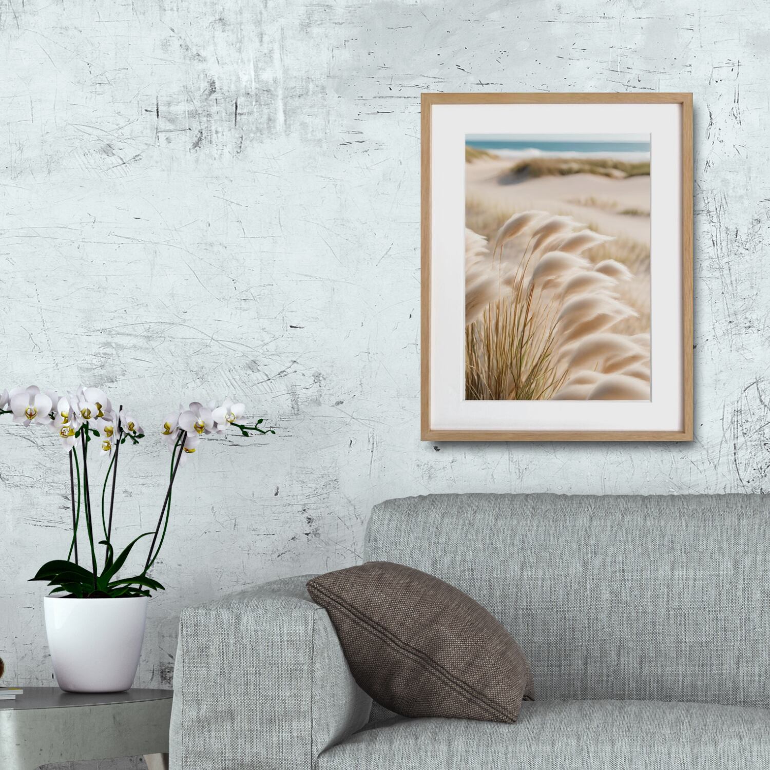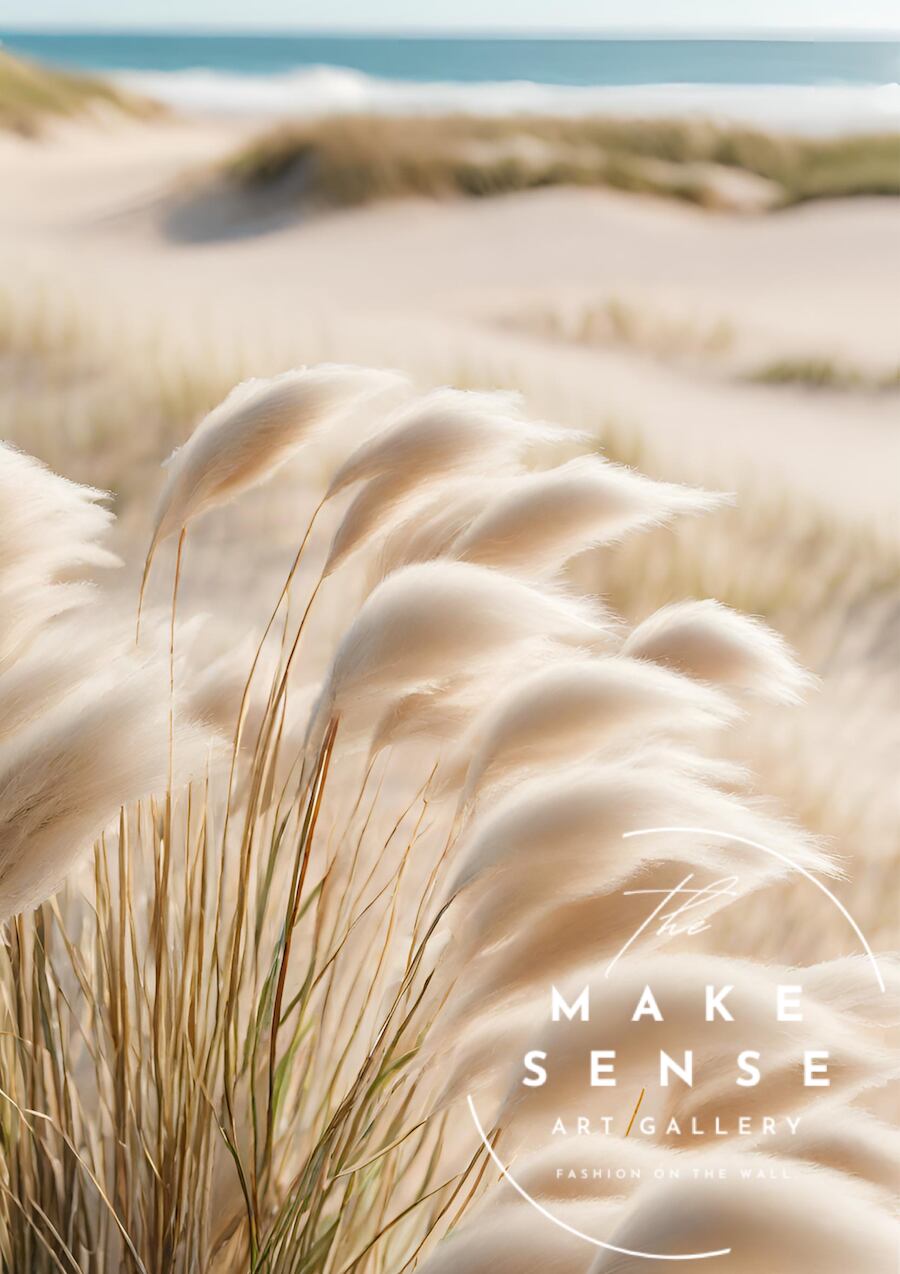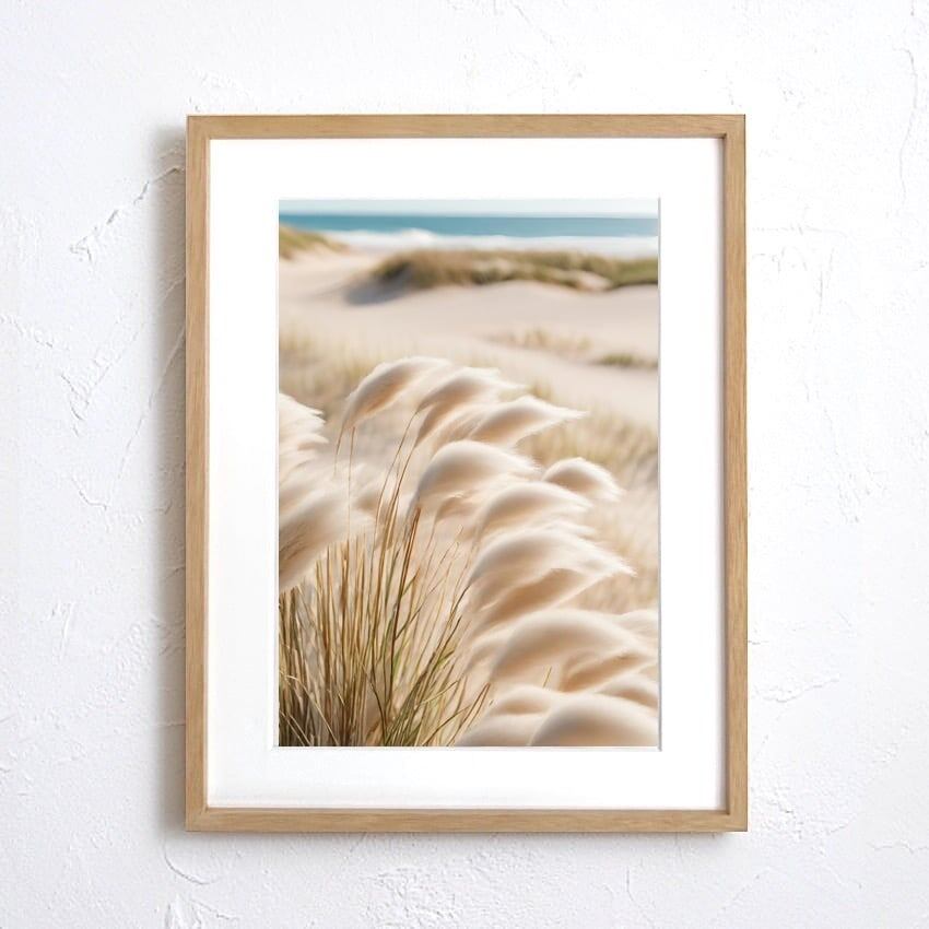 「Moments」は、砂浜を渡るやさしい風と揺れるススキを描いた北欧ボタニカルアートポスター。