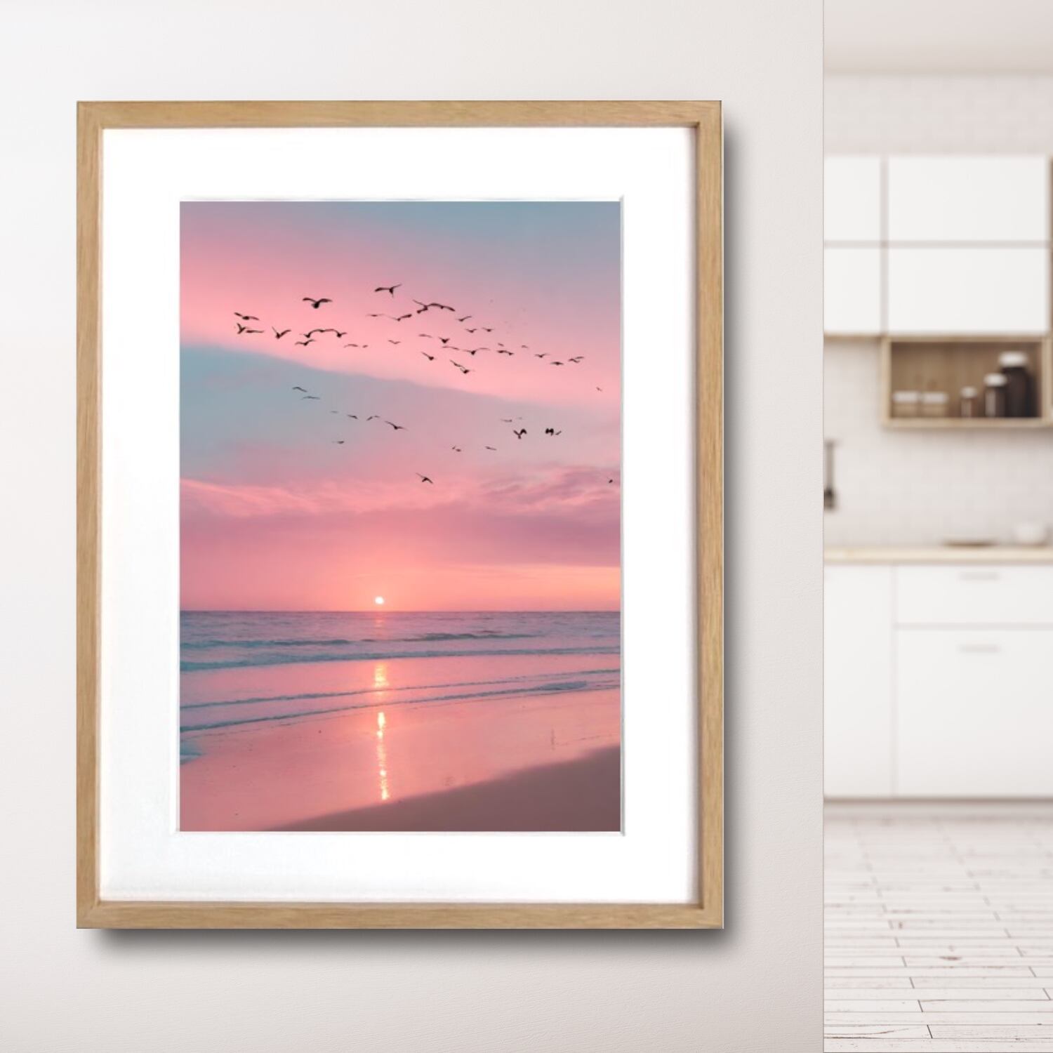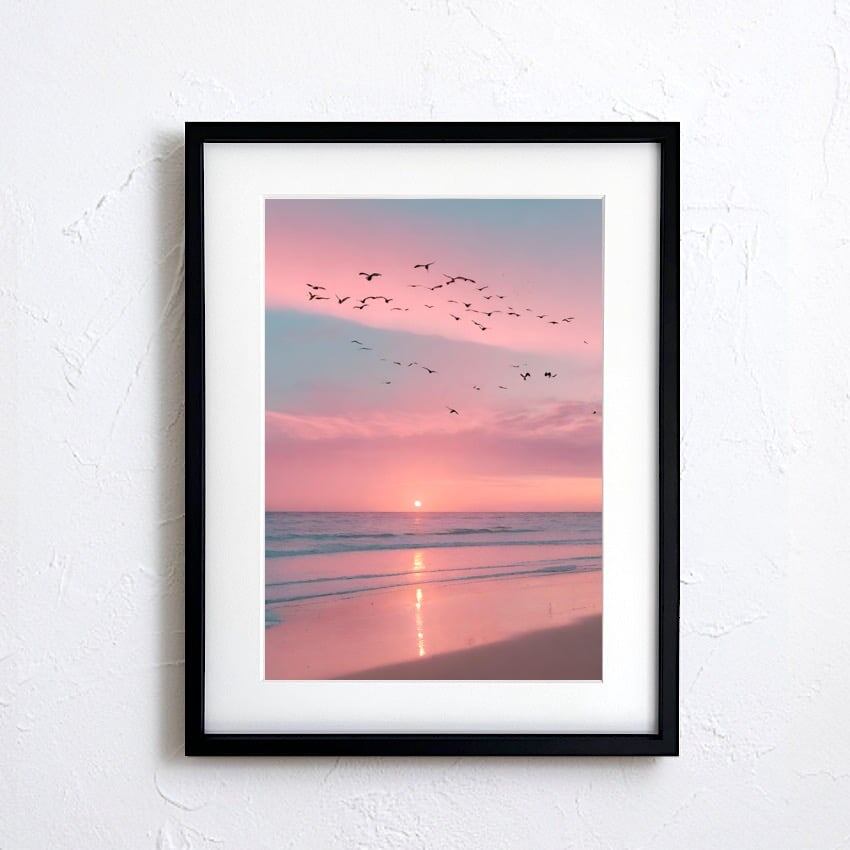 going back to home|夕陽と鳥が描く癒しのアートポスター|サンセットの穏やかな色合いで空間に安らぎをプラス|額縁セット|A4ポスター
