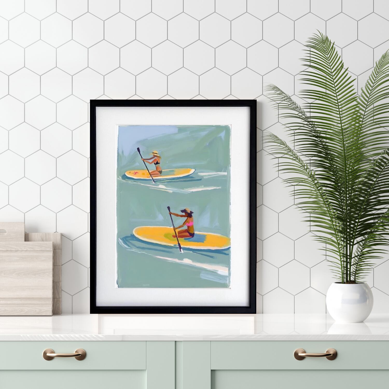 Sup|レトロな癒しのSUPアートポスター|北欧ナチュラル空間に調和する水辺の穏やかなドローイング|額縁セット|国内生産・A3ポスター