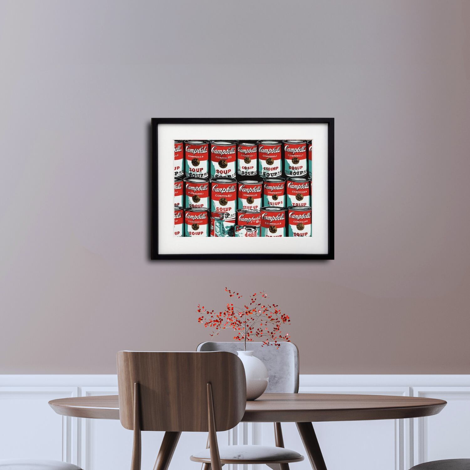 ポップアートの名作を思わせるスープ缶モチーフを、柔らかなドローイング調で再構築した1枚。