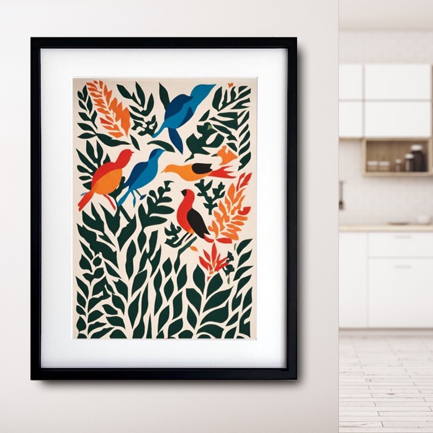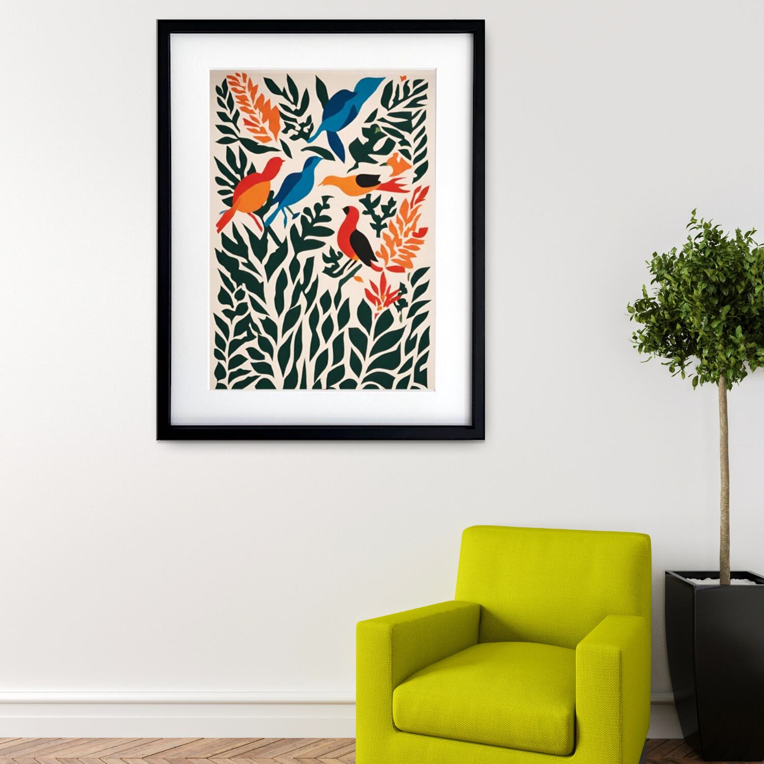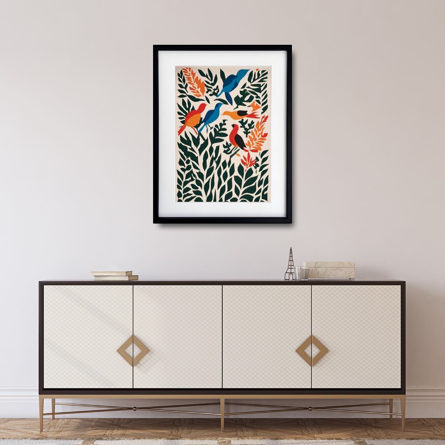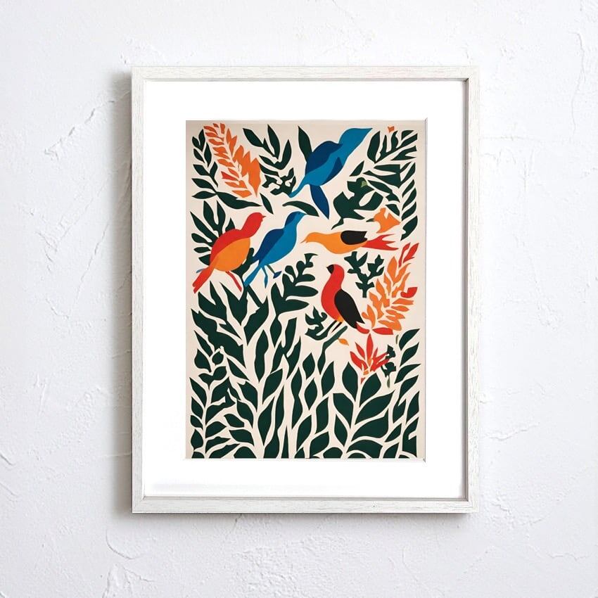Oasis|鳥とボタニカルを切り絵風に描く癒しのアートポスター|北欧・ナチュラル空間に合う爽やかなインテリア額縁付きA3ポスター