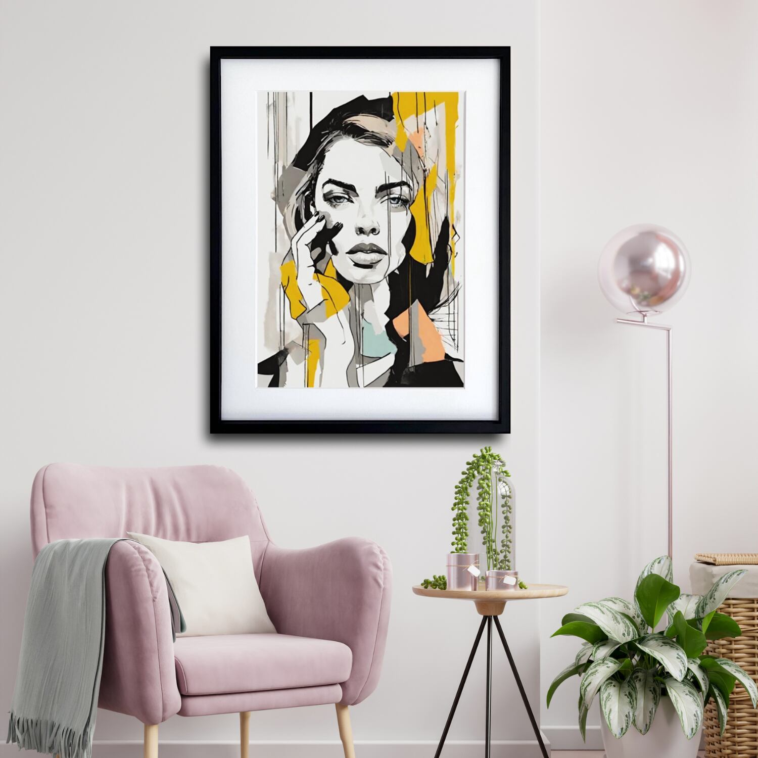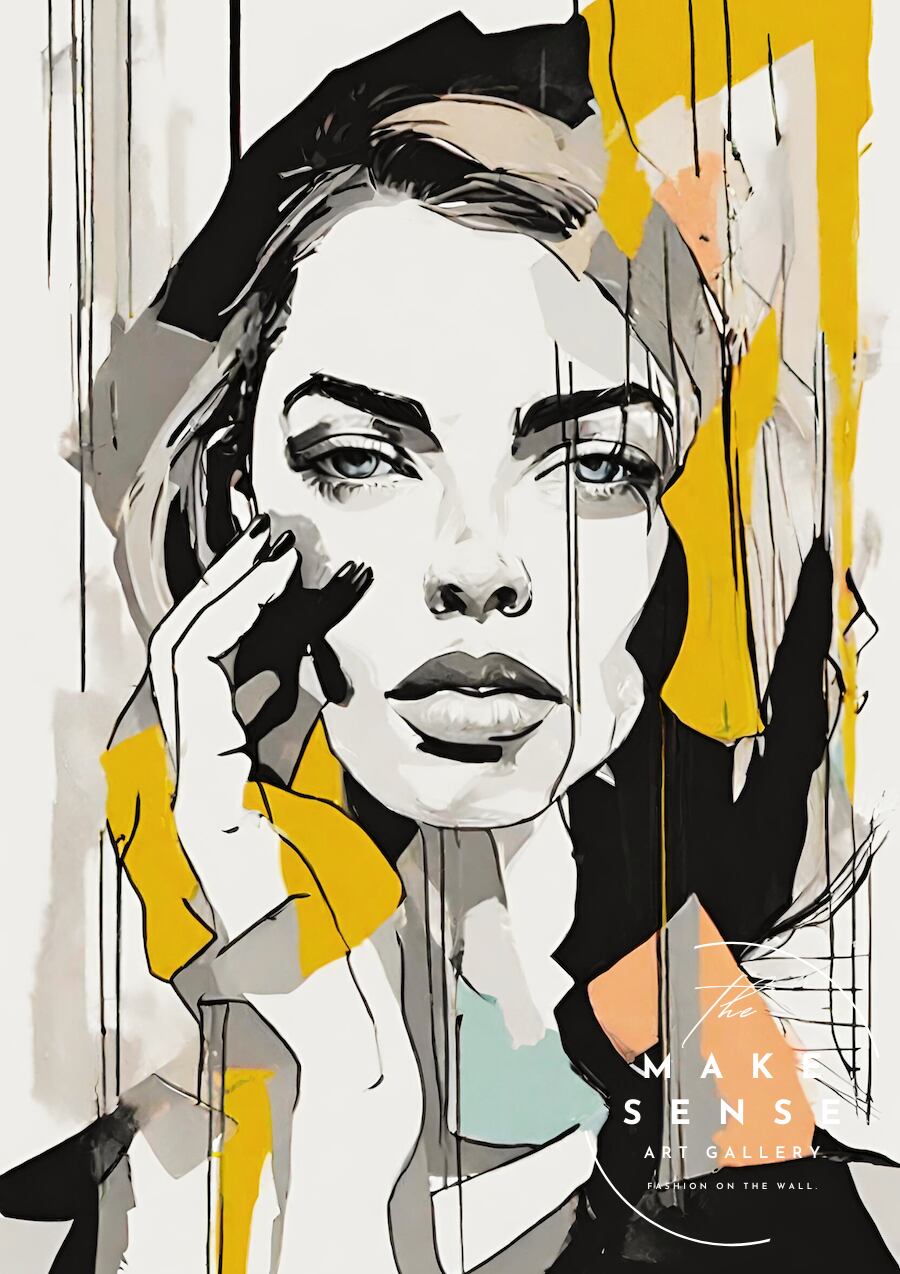 抽象的に描かれた女性モデルの肖像を、シックなくすみカラーでまとめたファッショナブルな一枚。