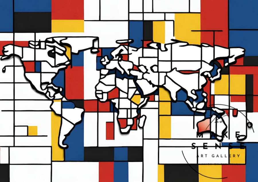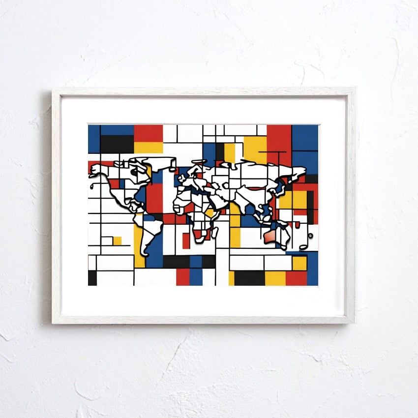 世界地図をカラフルに再構成した、旅心を刺激する抽象アートポスター。