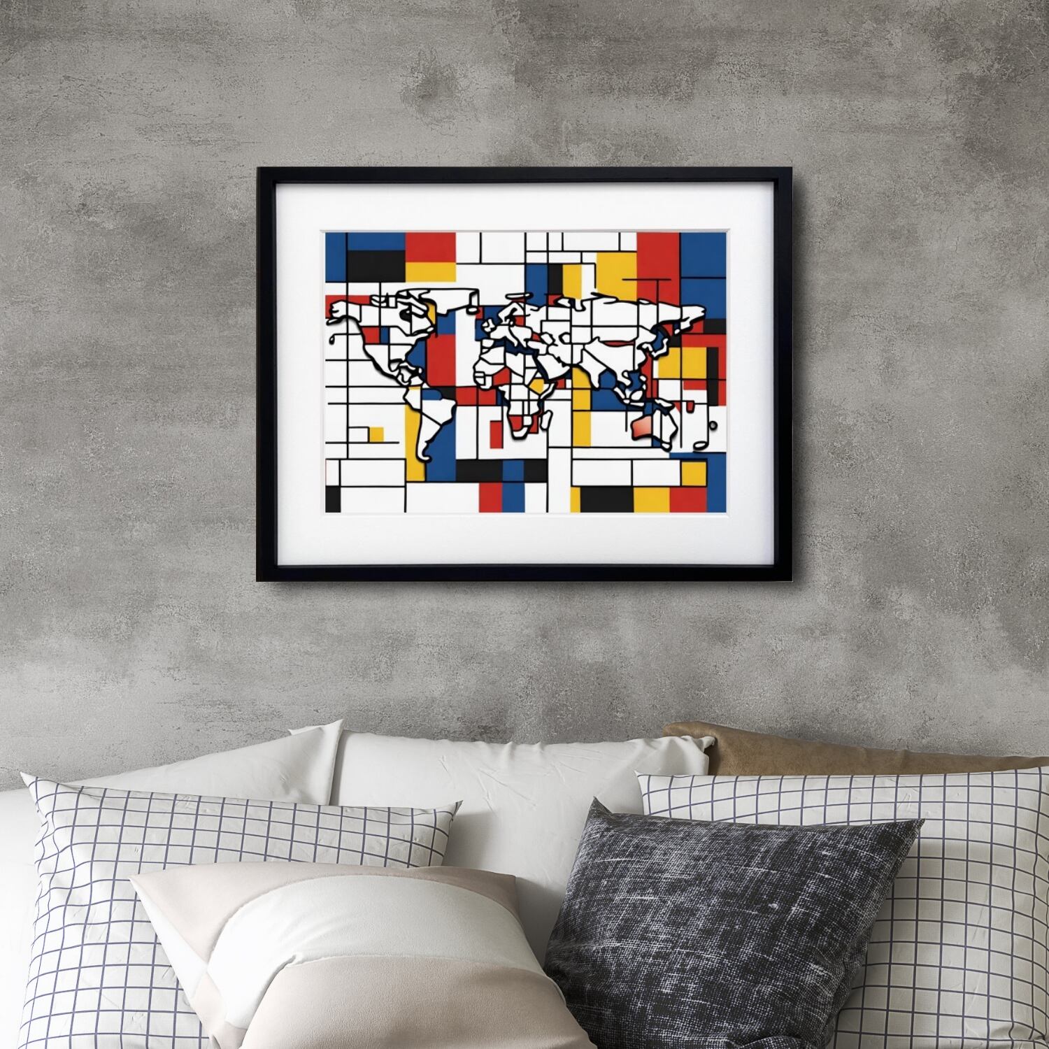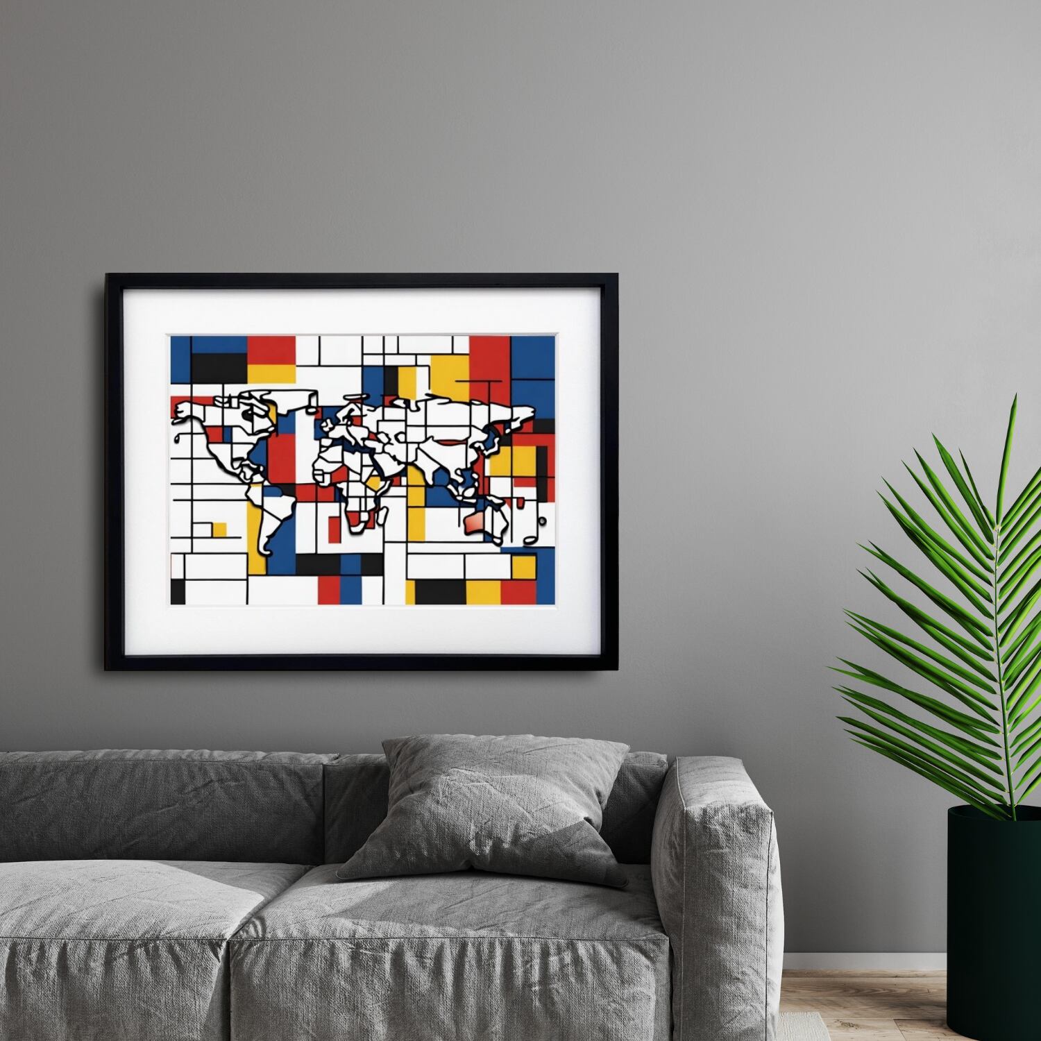 世界地図をカラフルに再構成した、旅心を刺激する抽象アートポスター。