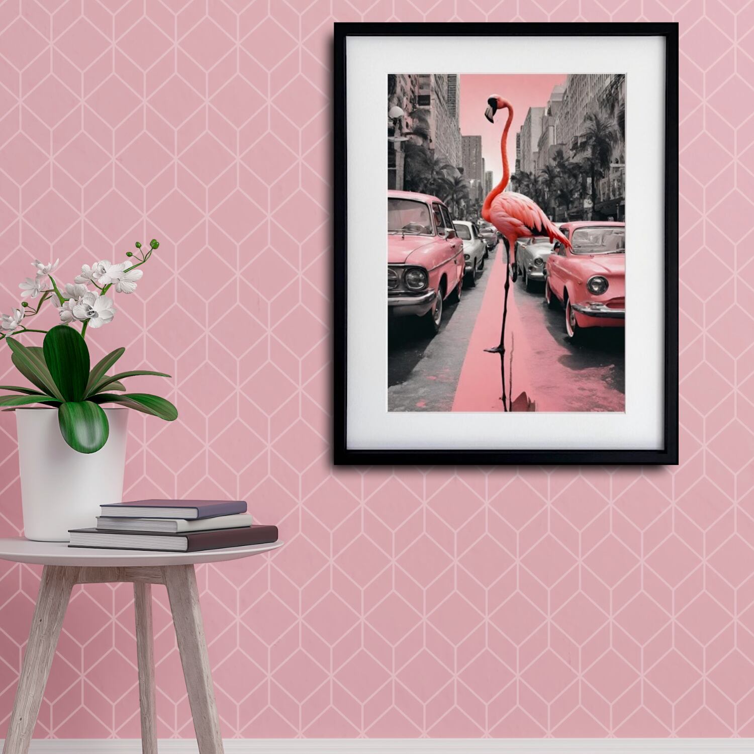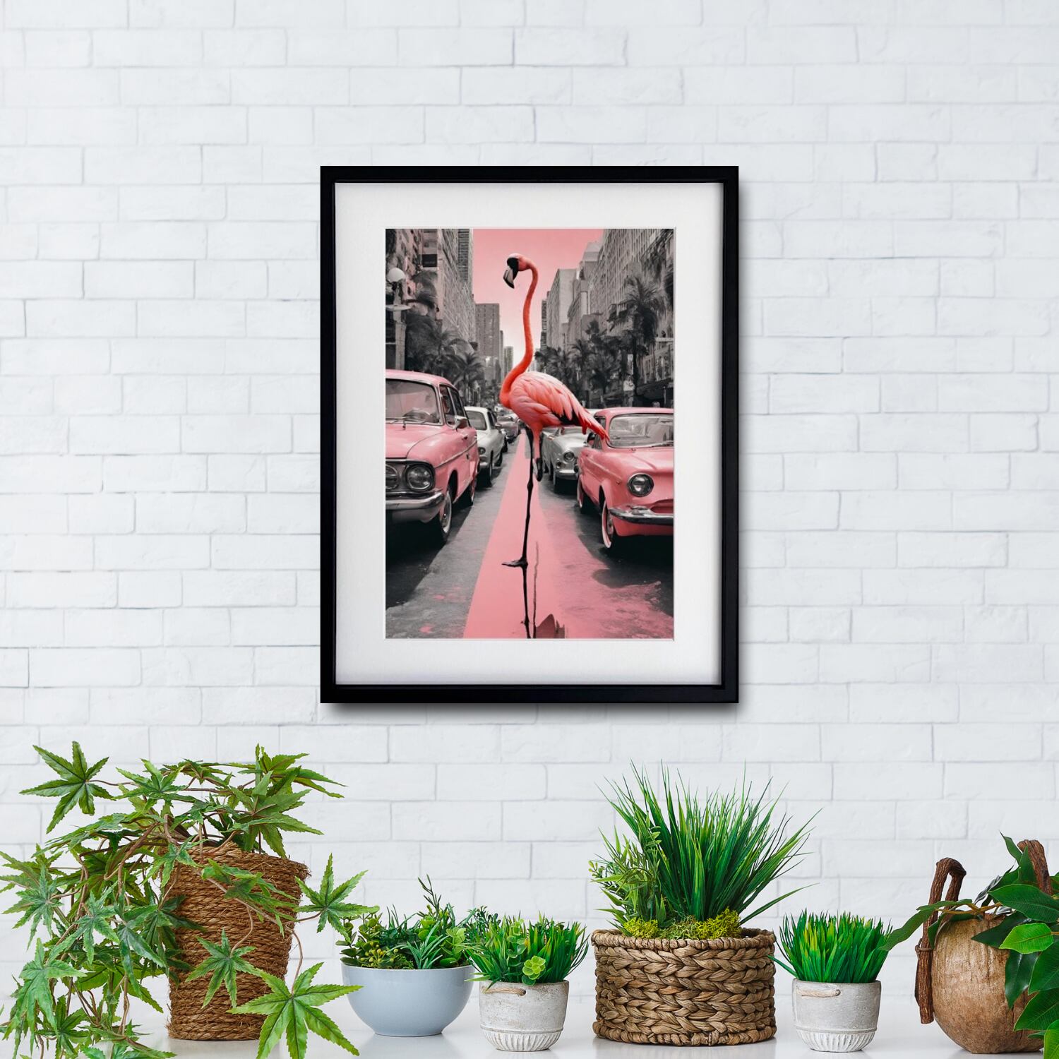 Flamengo Trip|都会を旅するフラミンゴのコラージュアート|ピンク×ブラックが映える遊び心の額縁付きポスターA3ポスター