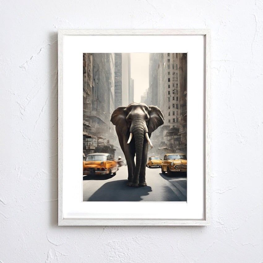 象が都会の街を旅する非日常の世界を切り取った、遊び心あふれるコラージュアート。