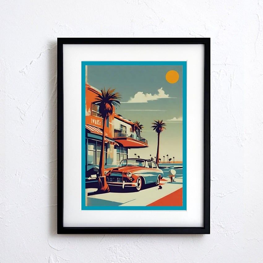 パームツリーとクラシックカーが描く、西海岸ストリートの空気を切り取ったアメリカンヴィンテージアート。