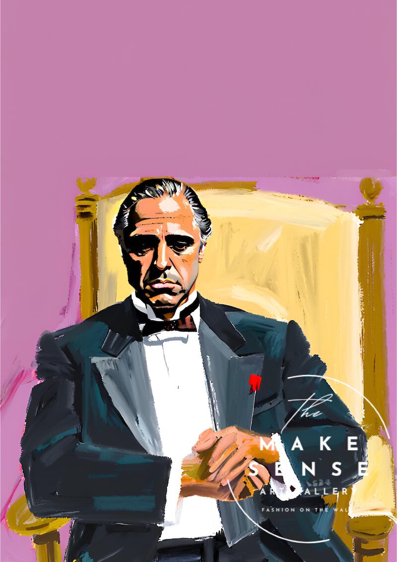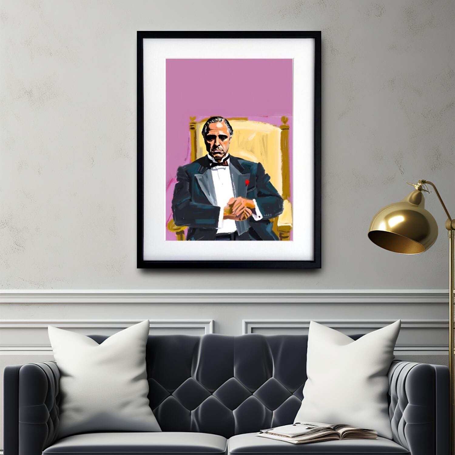 映画『The Godfather』の名優マーロン・ブランドをモチーフにした、モダンラグジュアリーなアートポスター。