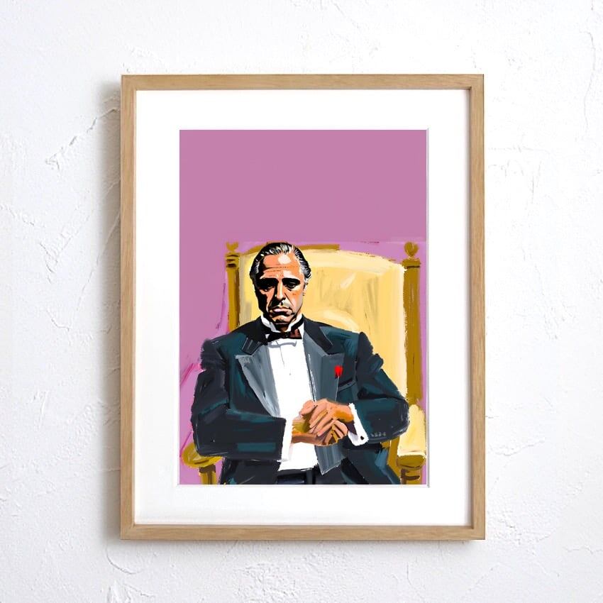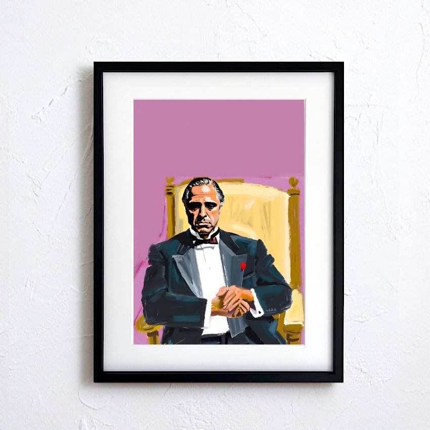 映画『The Godfather』の名優マーロン・ブランドをモチーフにした、モダンラグジュアリーなアートポスター。