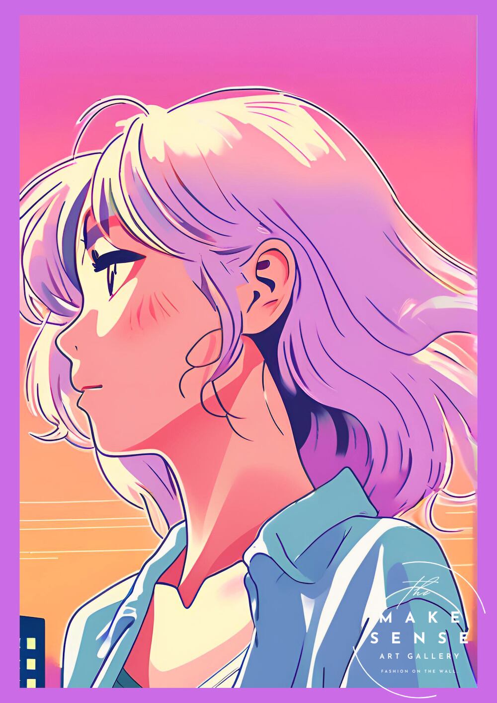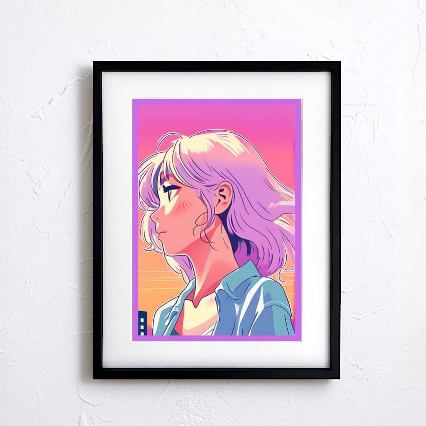 夕焼けグラデーションに佇む横顔アートポスター『Afterglow』|ラベンダーヘアが映えるエモーショナルな一枚:|A3ポスター