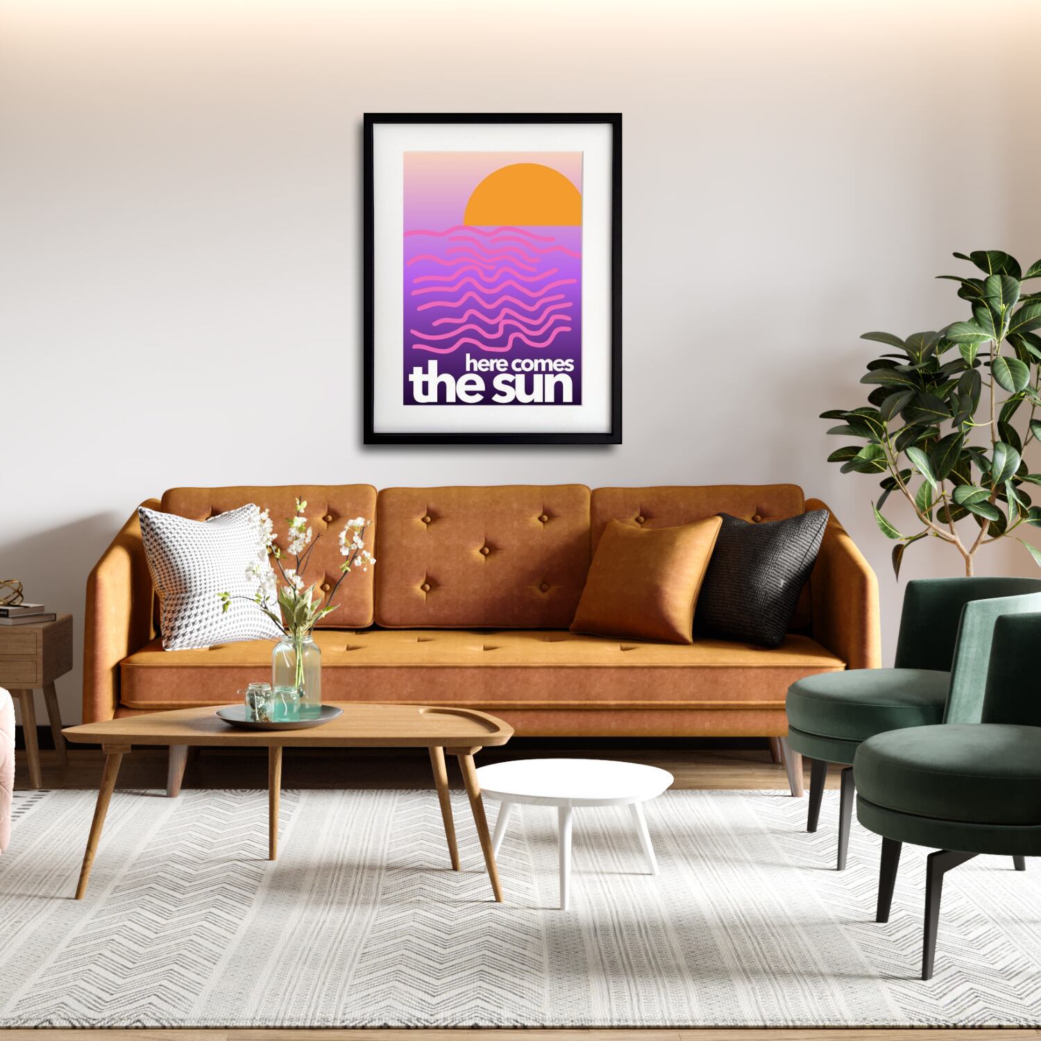 北欧ミッドセンチュリー調サンセットアートポスター『Here Comes The Sun』|ミニマルな波と太陽のグラフィック:|A2ポスター