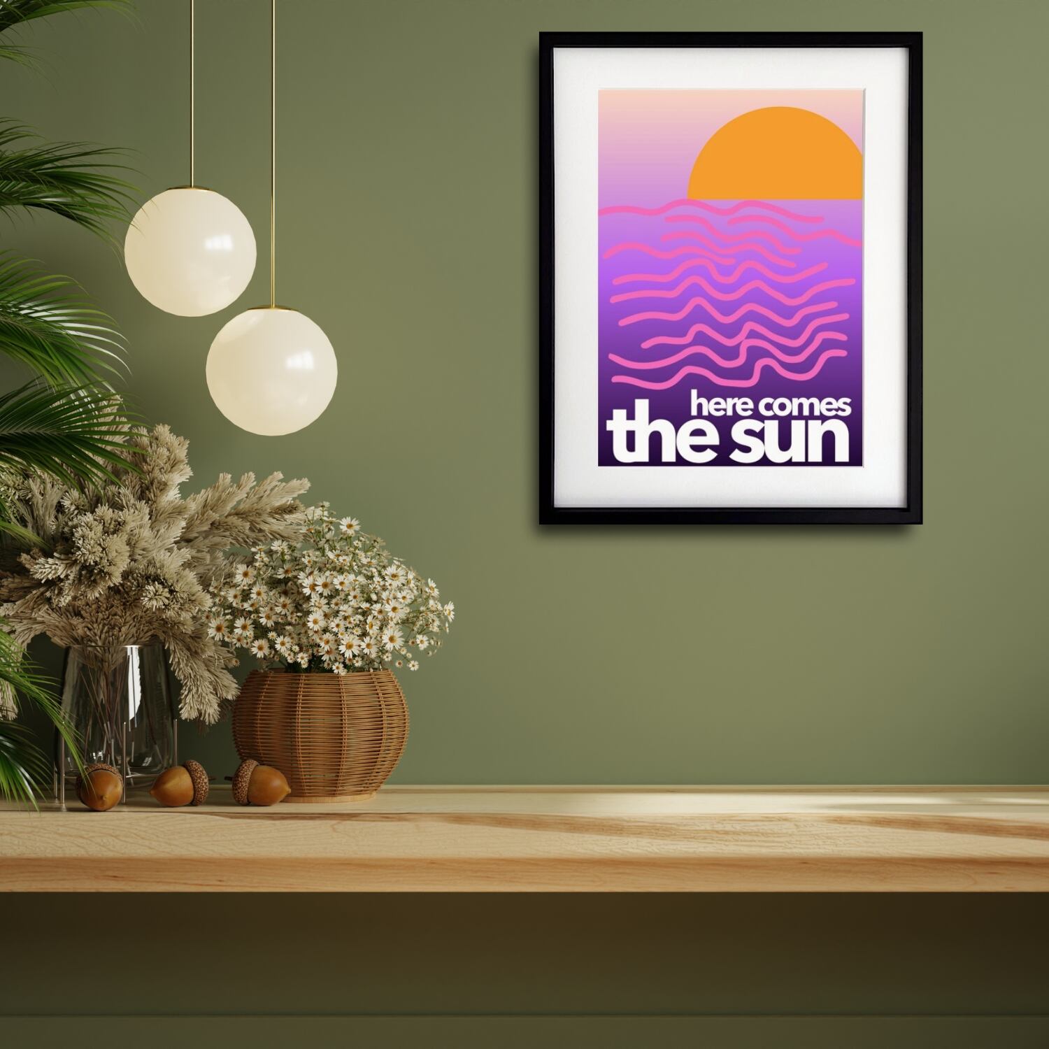北欧ミッドセンチュリー調サンセットアートポスター『Here Comes The Sun』|ミニマルな波と太陽のグラフィック:|A4ポスター